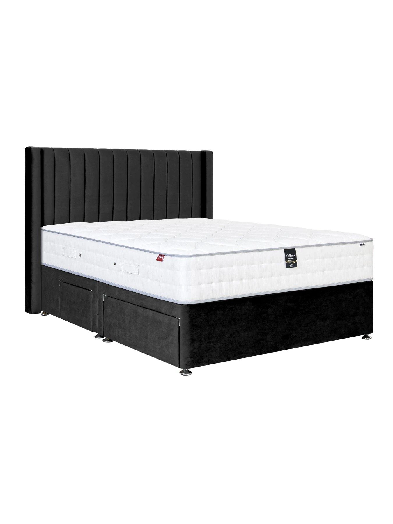 The versatile divan is upholstered with a stunning, velvet fabric with a choice of dark grey or black and finished with stylish chrome glides. Choose from either 4 or 2 drawers or as a non-storage platform base.