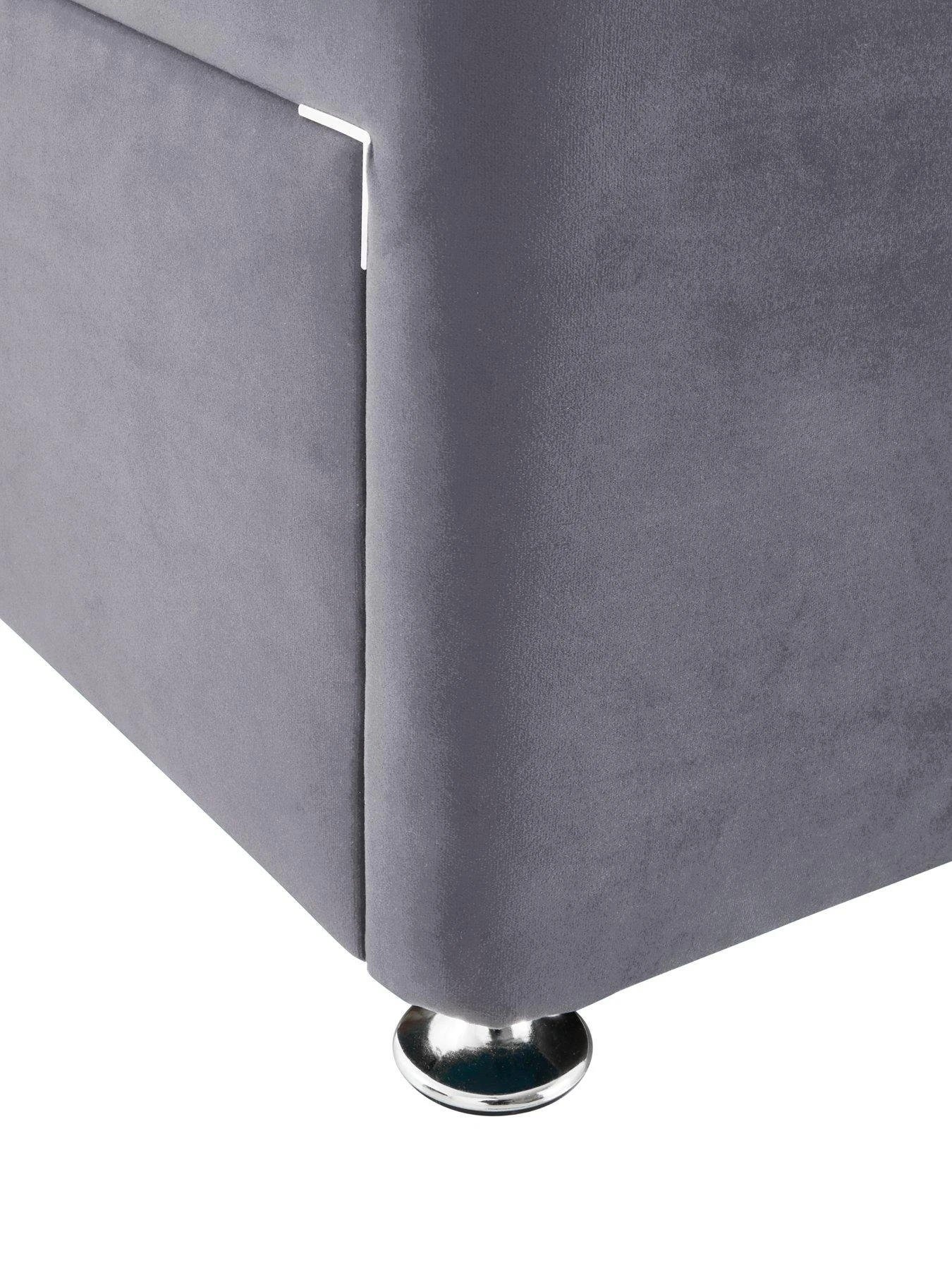 - Upholstered in a luxurious velvet fabric which is available in a grey or teal colour