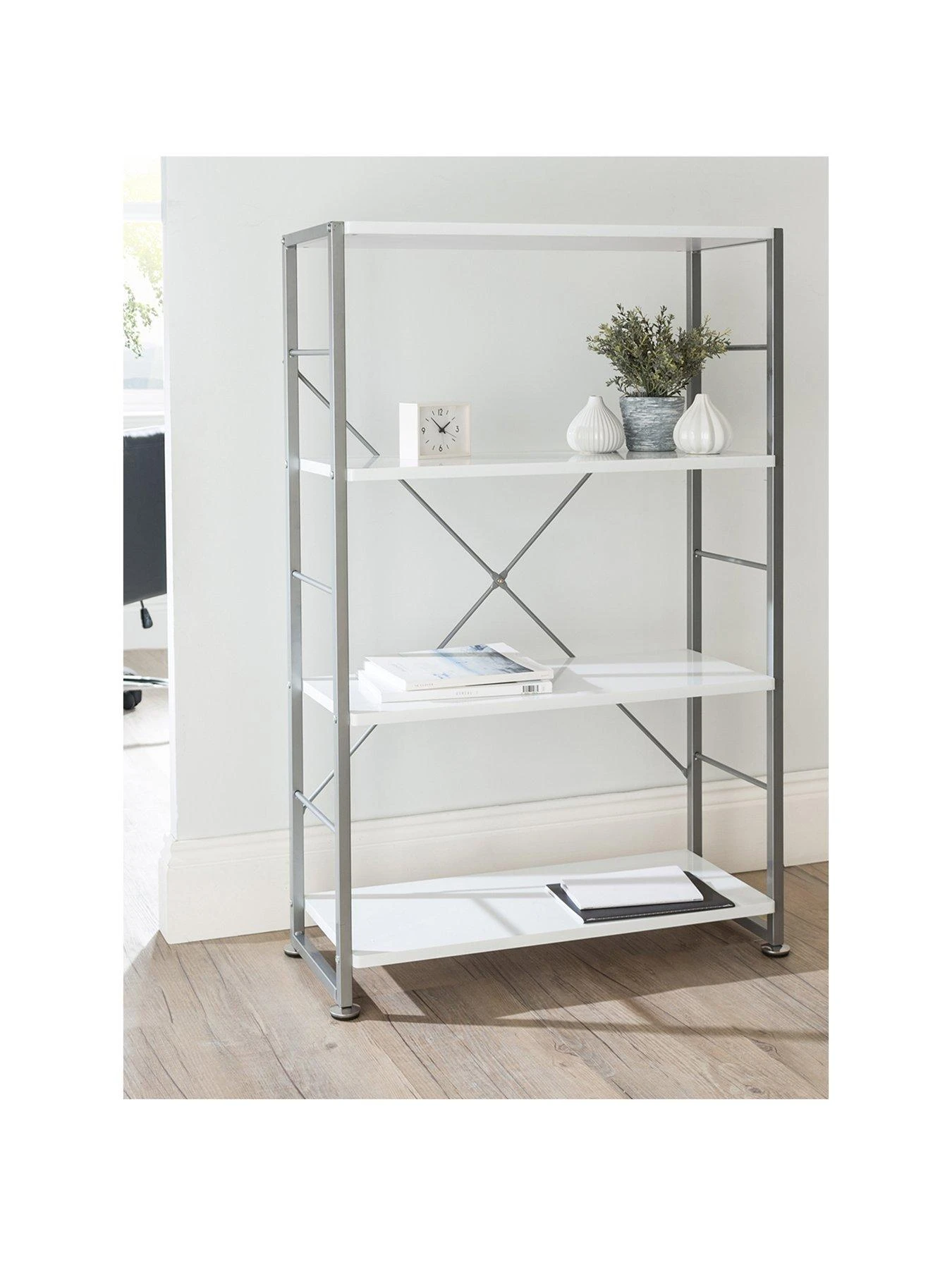 A truly modern way to show off your collection of books, ornaments and more, it features 4 white shelves which are supported by a grey frame. Adjustable feet allow for easy alignment on uneven floors, while a wall attachment keeps it secure for safety.