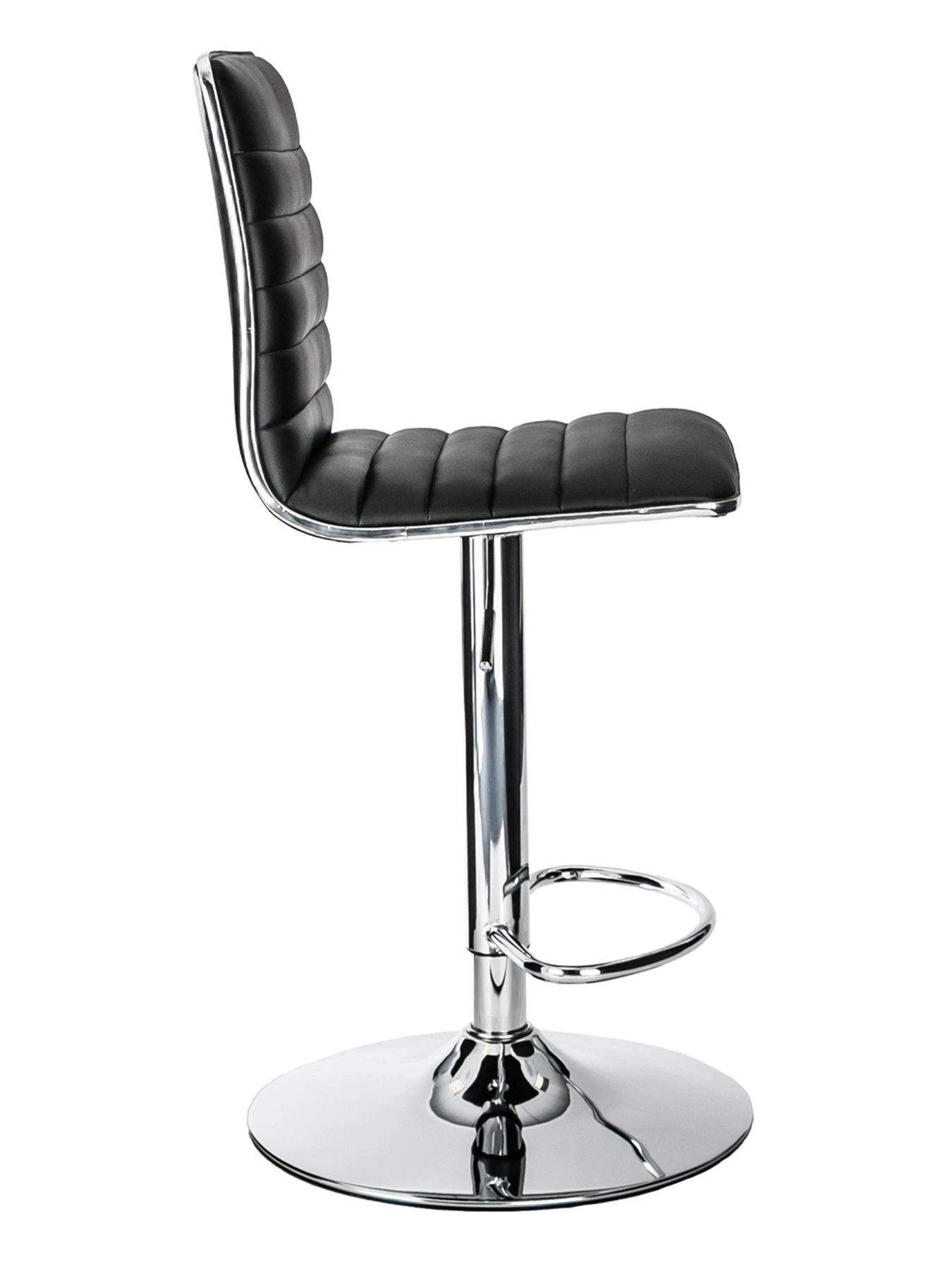 The seat is outlined in a shiny, light-catching chrome, which also covers the base and footrest, and it can be rotated 360 degrees and height adjusted between 97.5 and 117.5 cm.