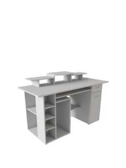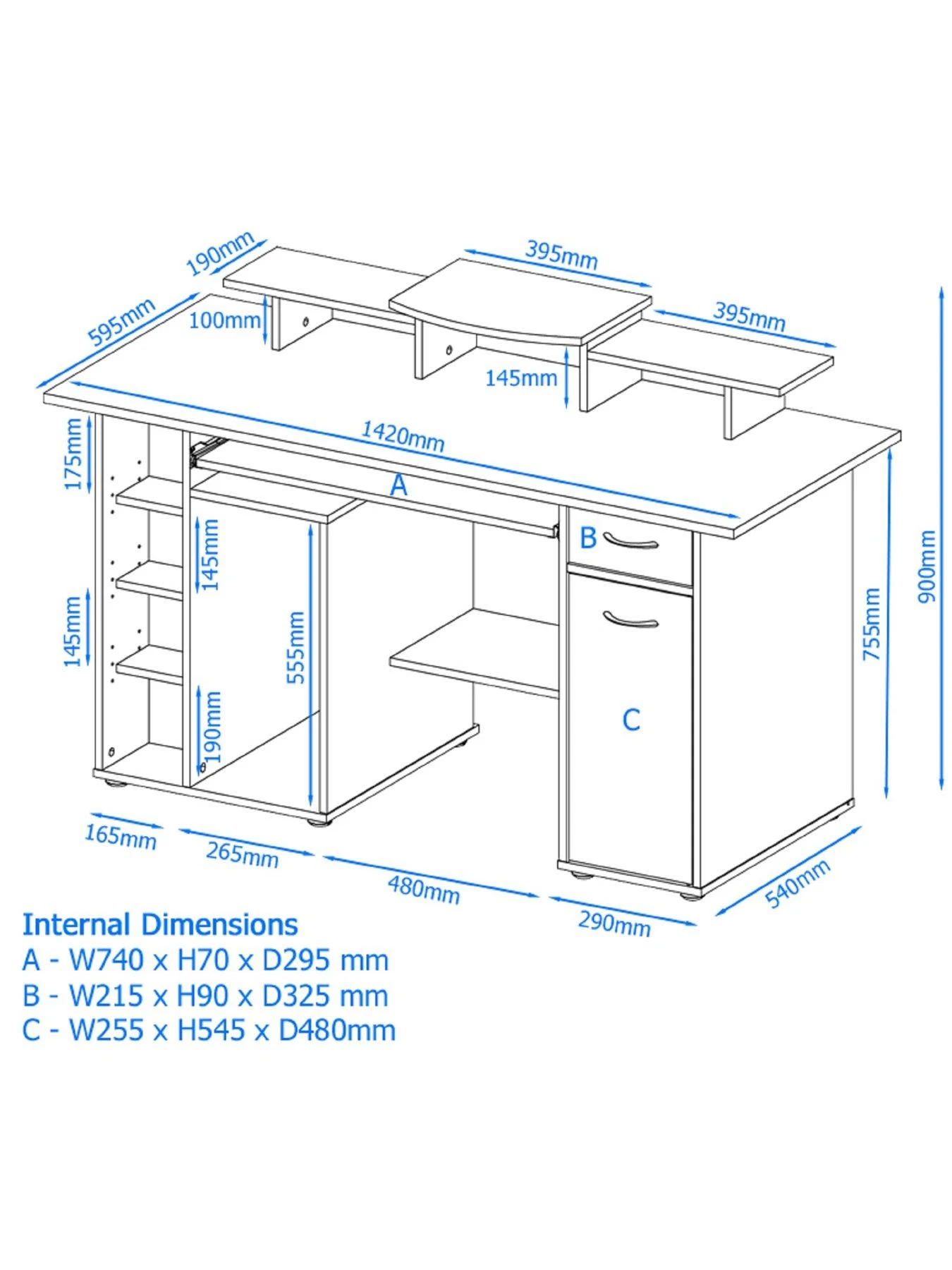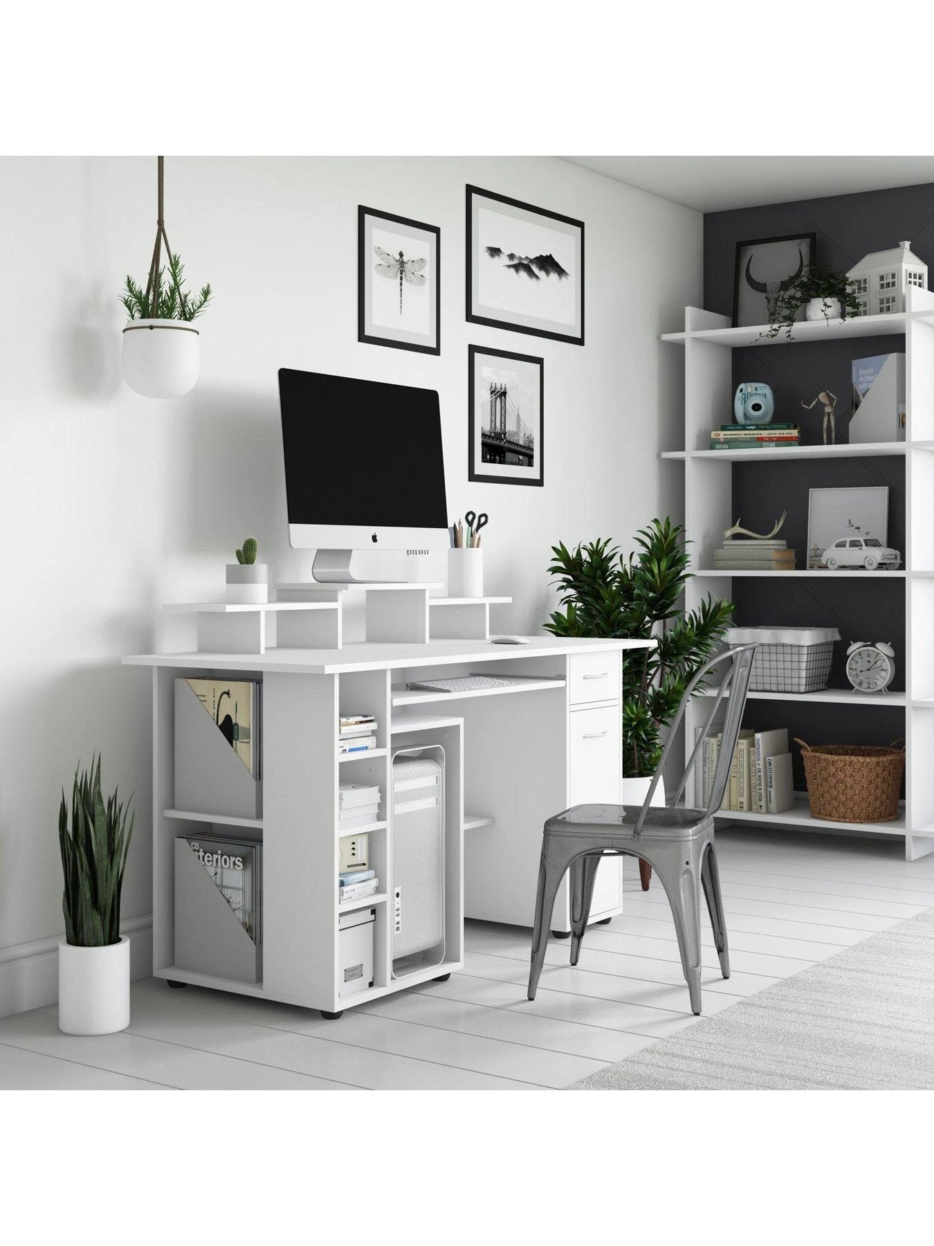 Containing huge amounts of storage space the San Diego workstation is both practical and beautiful. The wood effect finish is perfectly complimented by chrome handles, and sturdy hidden feet protect your floors and carpets. The San Diego boasts; large CPU storage, stationery drawer, storage cupboard, printer shelf, sliding keyboard shelf, 4 storage compartments, as well as a 3 height raised monitor platform with additional storage. This workstation is a must for any busy office.
