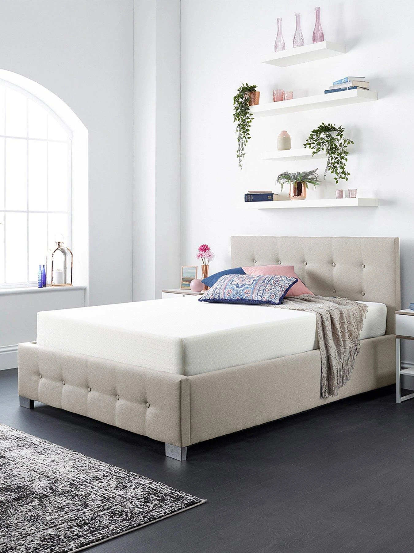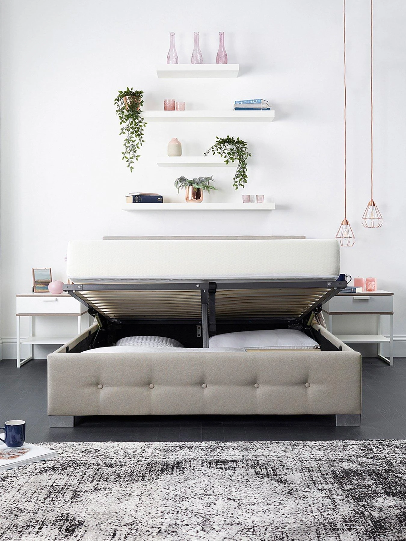 It comes in a soft natural shade you can match with all kinds of decors and bedding designs, and the mattress base can be manually lifted with the help of the hydraulic pistons to reveal a roomy ottoman storage area that’s perfect for spare bedding and pillows.