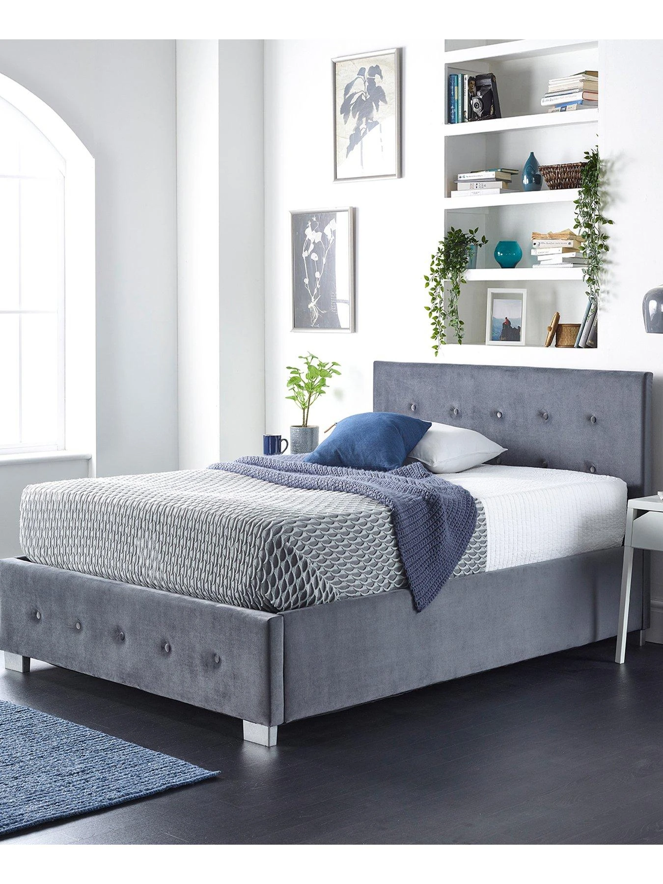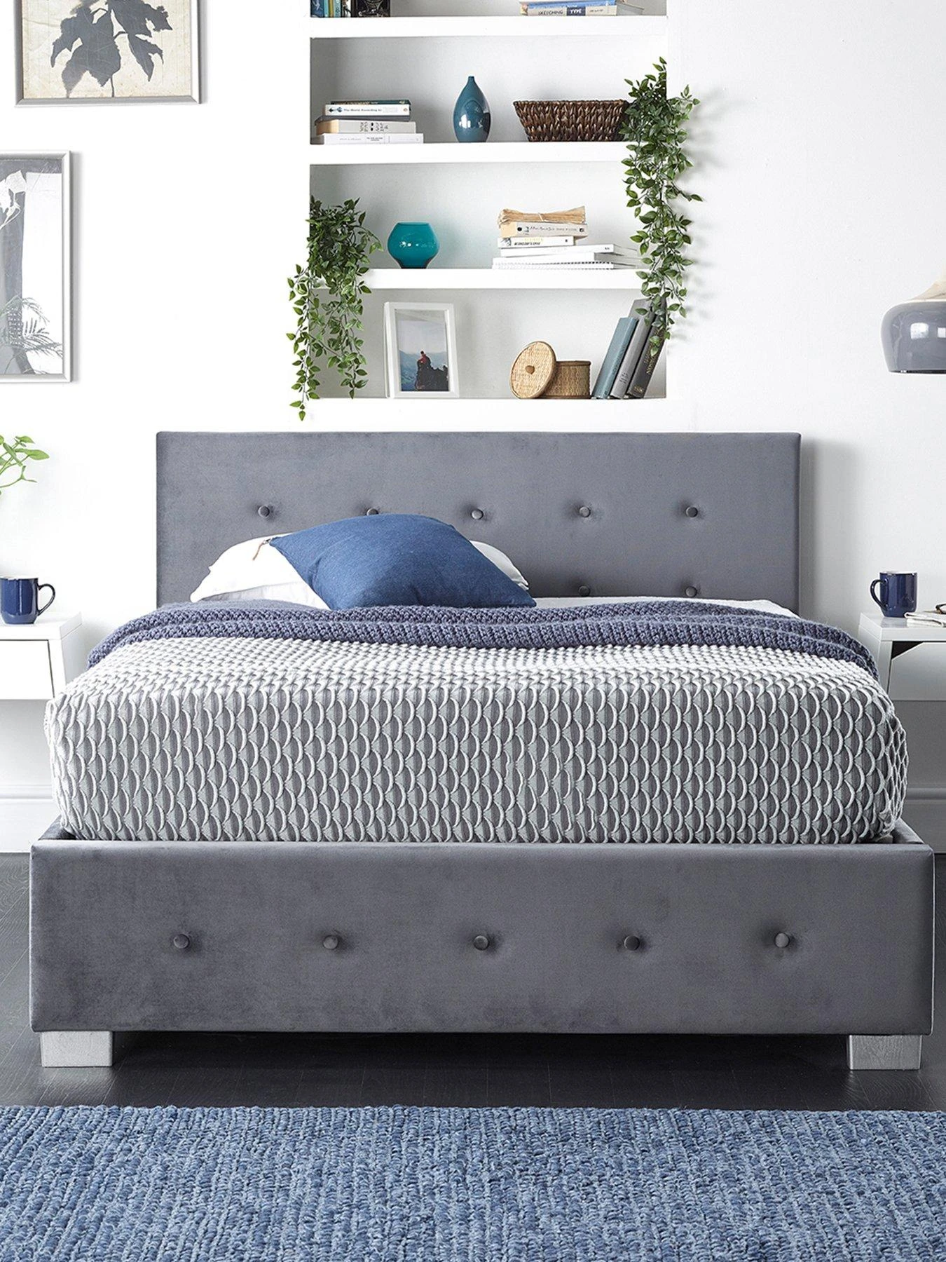 Style-wise it’s all about the plush velvet fabric that comes in a show-stopping steel shade. The headboard features classic buttoned headboard with padding for added comfort when sitting up in bed, while a matching buttoned footboard ensures the end looks just as good.