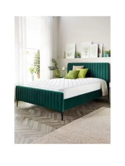 It’s upholstered in a wonderfully piled brushed velvet fabric and comes in a choice of go-with-everything grey or rich, lush green for a pop of colour. The built in headboard and footboard are glammed up with striking vertical stitching, while smooth curvy corners soften the silhouette and form an eye-catching contrast against the straight edges of your bedside table and chest of drawers.