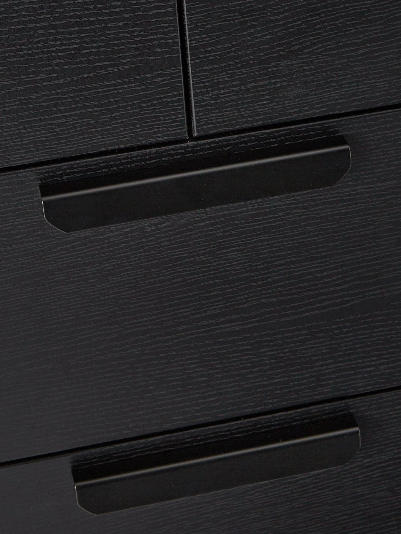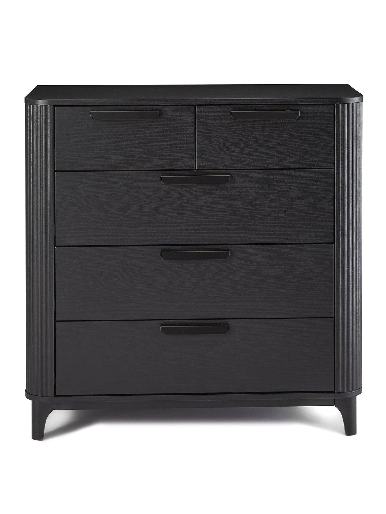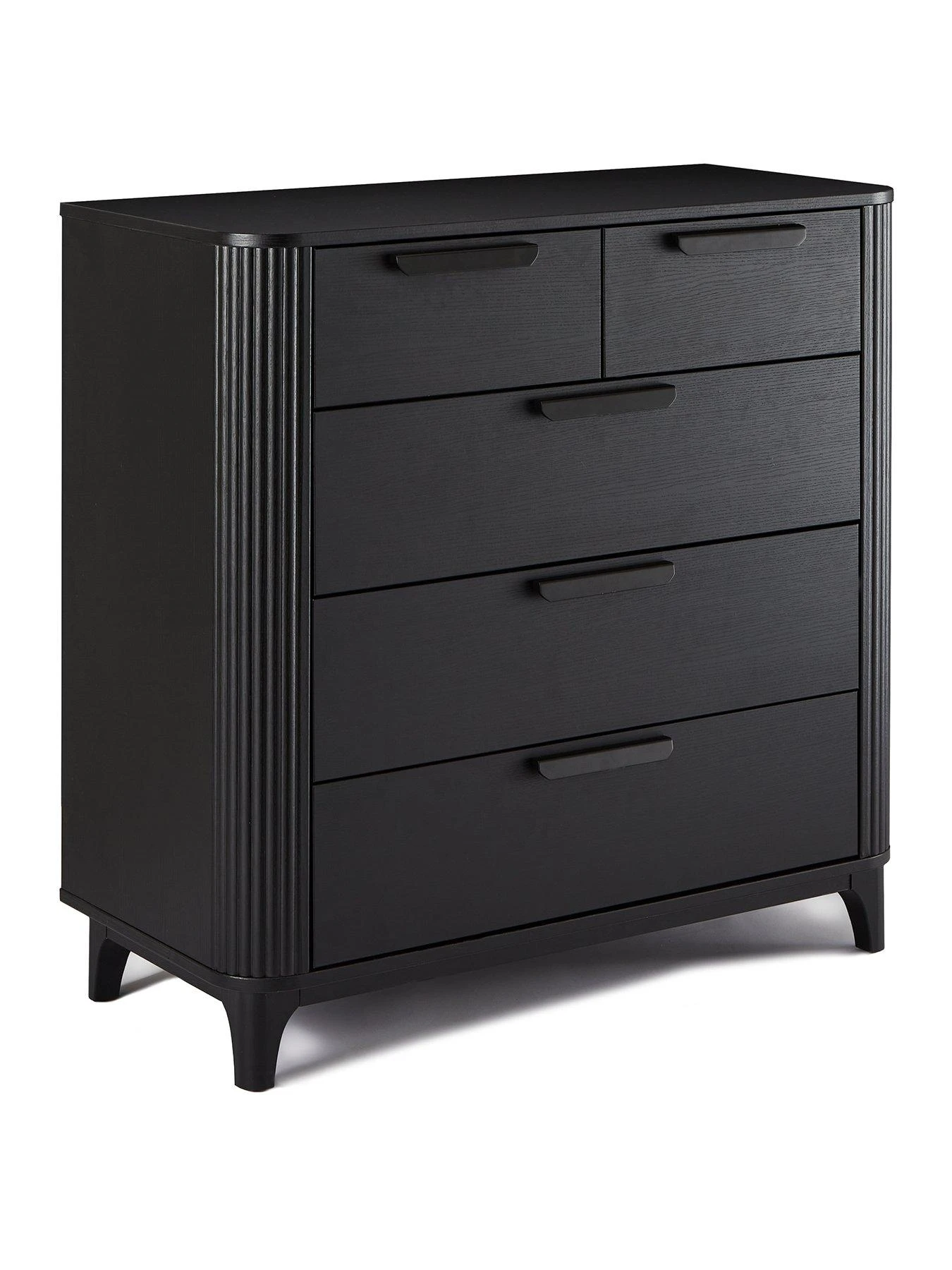 Key to its stand-out style is the ribbed detail and dramatic black shade. Five drawers (three wide, two narrow) glide quietly open even when full thanks to the metal runners, and they’re accented with matchingĀ metal handles.