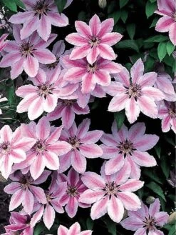 Clematis âNelly Moser’ is a very attractive and resilient climber. Its most notable features are the striking single flowers which are fantastically colourful with white petals striped with deep pink and holding dark red anthers in their centre. These large flowers will bloom in the early Summer, with a possible second round later in the year approaching Autumn, giving you garden display full of splendid colour throughout the Summer. Plant in moist, well-drained soil. Prefers partial sun as full sun may cause bleaching or fading of colour from the flower petals.