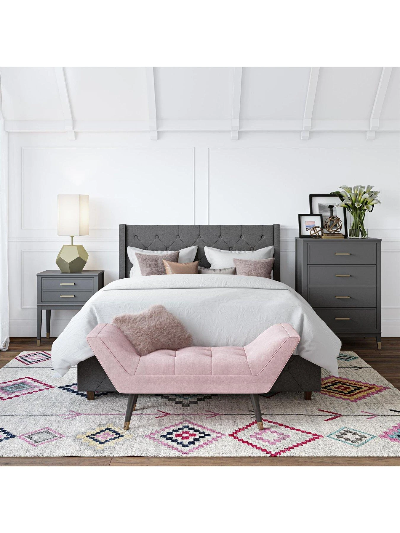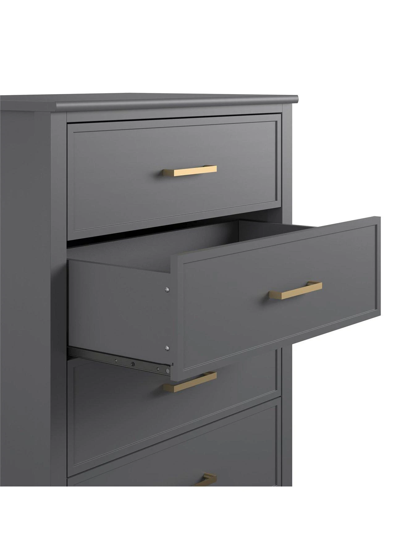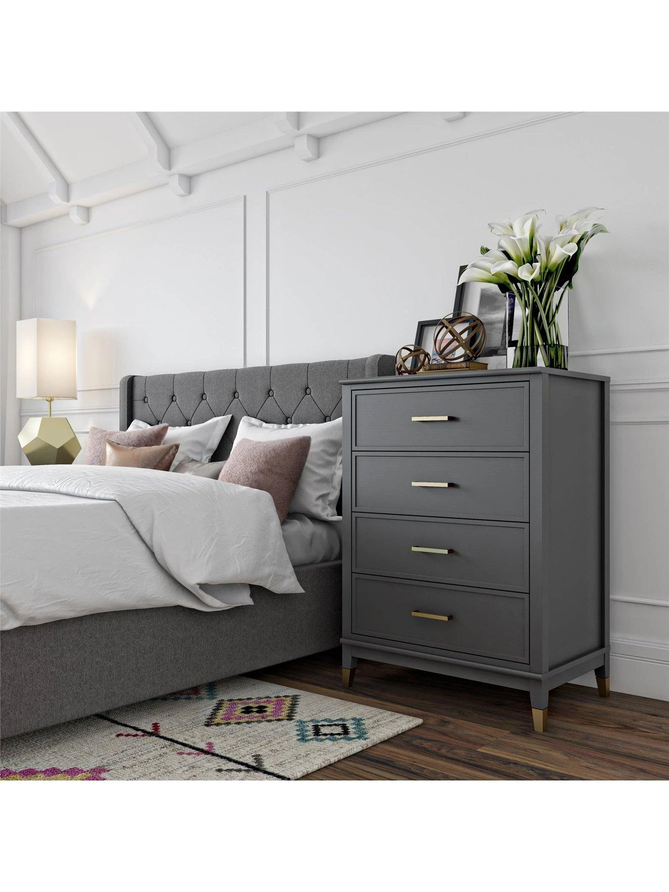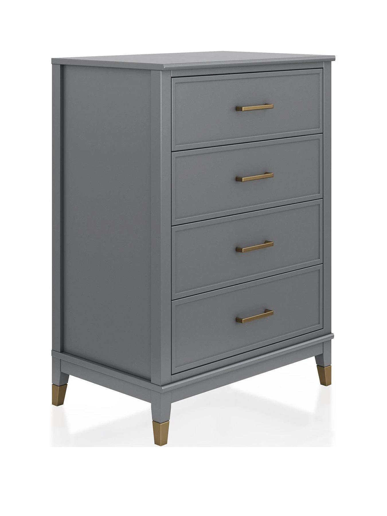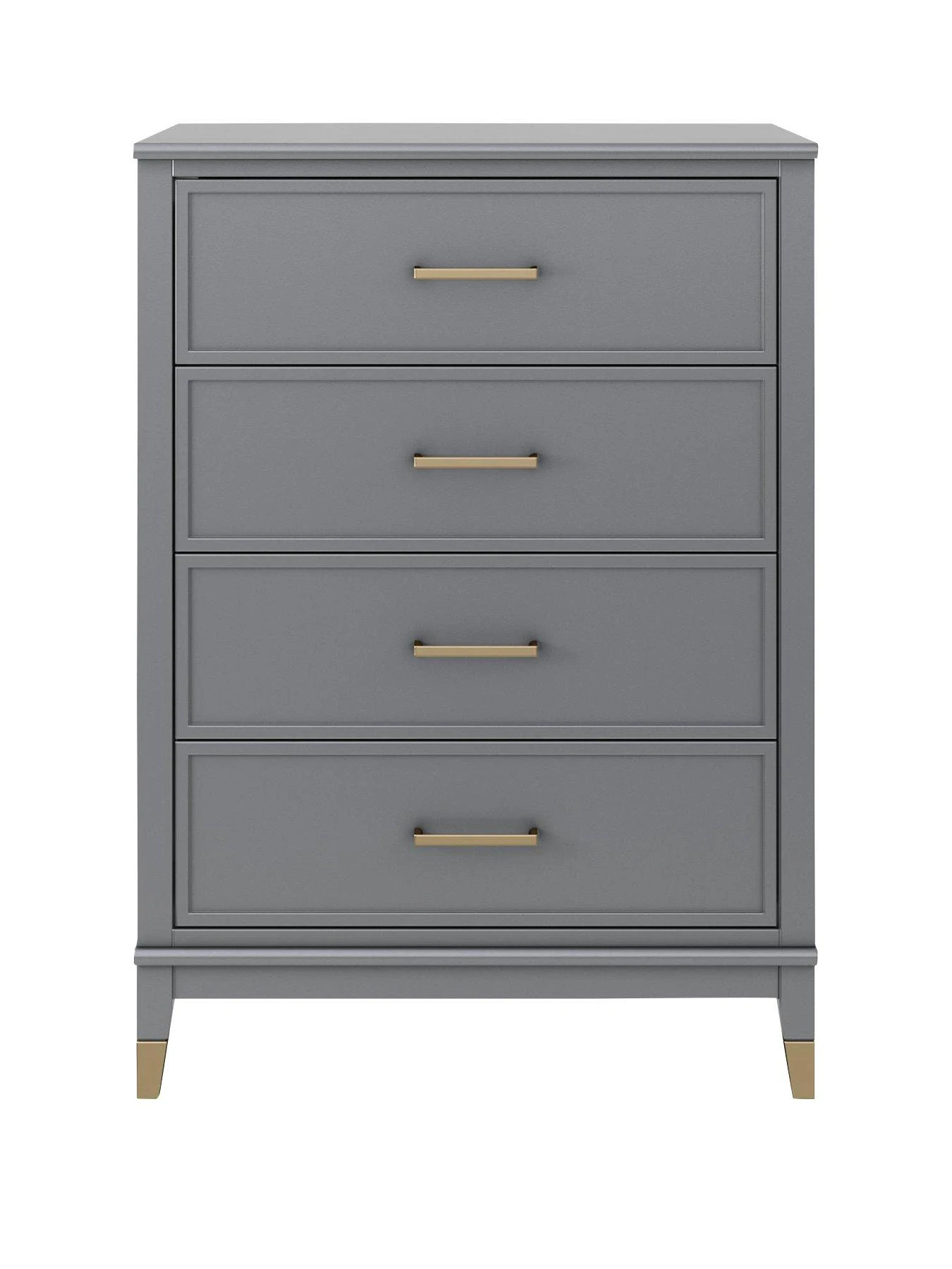 The four spacious drawers flaunt gorgeous framed fronts, and the smooth graphite grey painted finish is accented with trendy gold feet and metal handles. It comes complete with an wall anchor kit to prevent the risk of tipping.