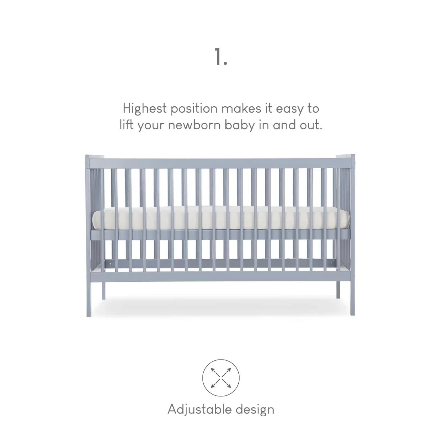 Suitable from from birth to approximately 5 years old, the Nola Cot Bed in flint blue will brighten up even the smallest nursery. It has 3 mattress base positions, allowing you to easily change the height as your baby grows to keep them safe and look after your back when you lift. The Nola can also effortlessly be converted to a day bed as soon as your child is old enough by removing the sides.