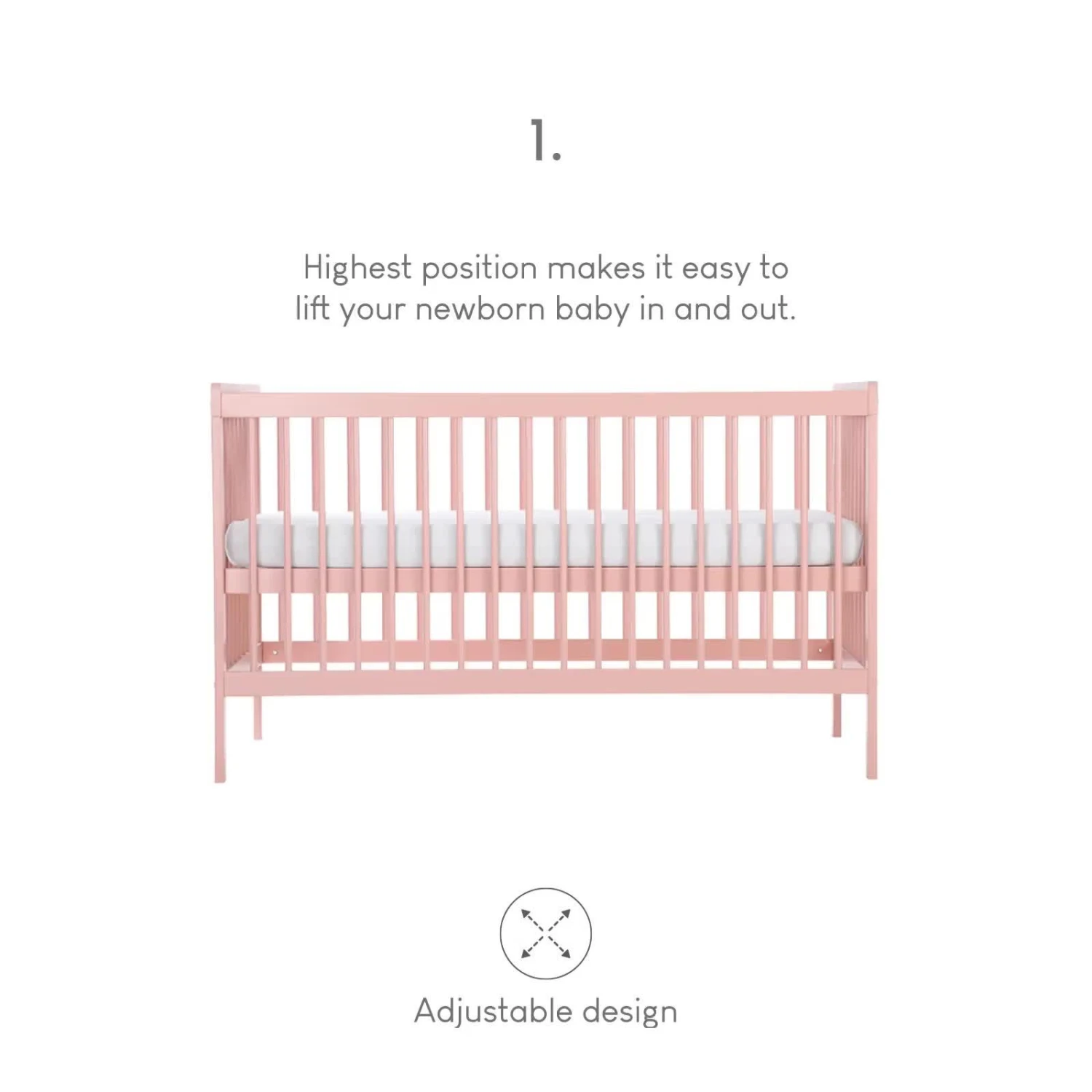 Suitable fromĀ from birth to approximately 5 years old, the Nola Cot Bed in blush pink will brighten up even the smallest nursery.Ā It has 3 mattress base positions, allowing you to easily change the height as your baby grows to keep them safe and look after your back when you lift. TheĀ NolaĀ can alsoĀ effortlessly be converted to a day bed as soon as your child is old enough by removing the sides.