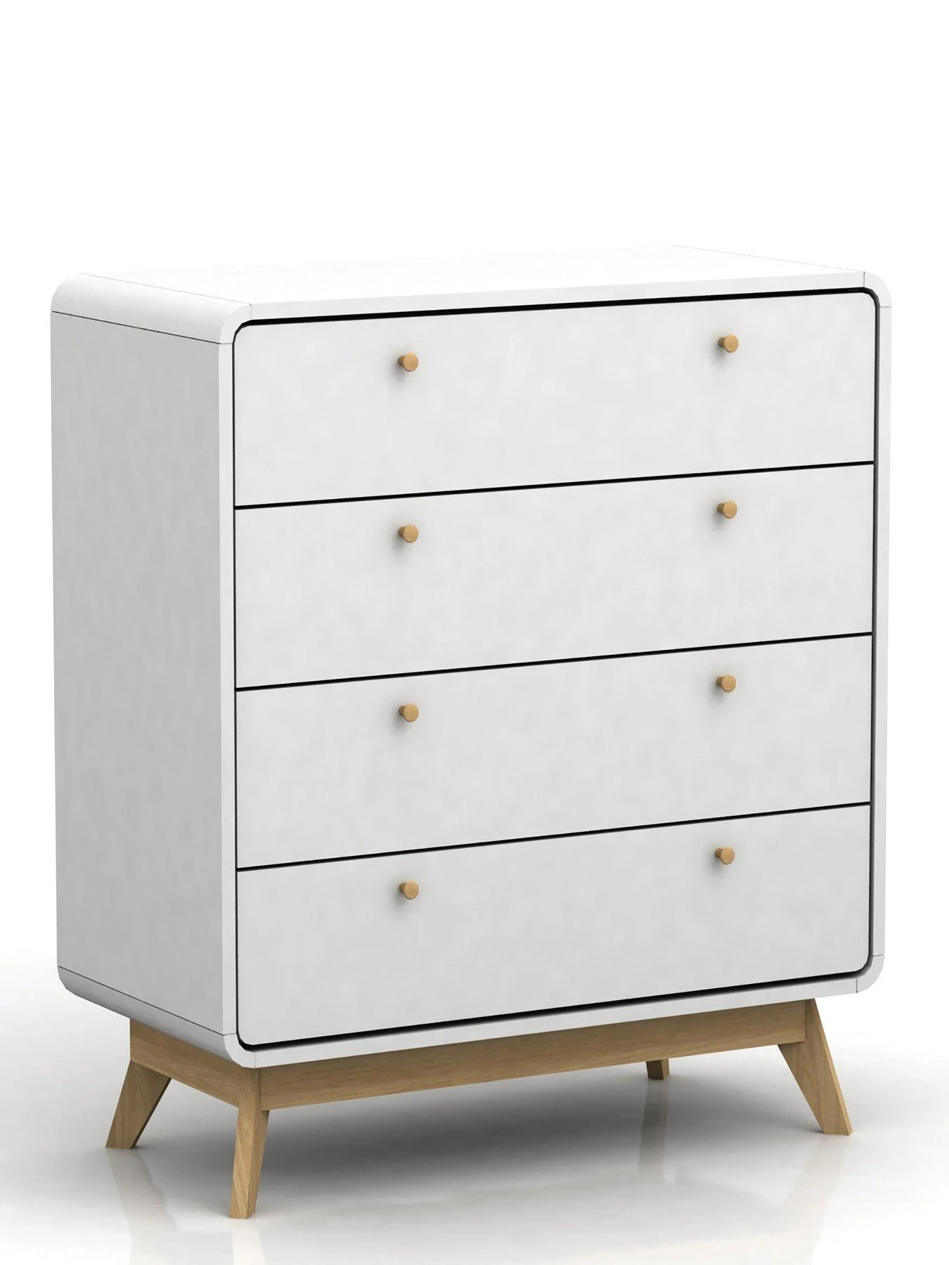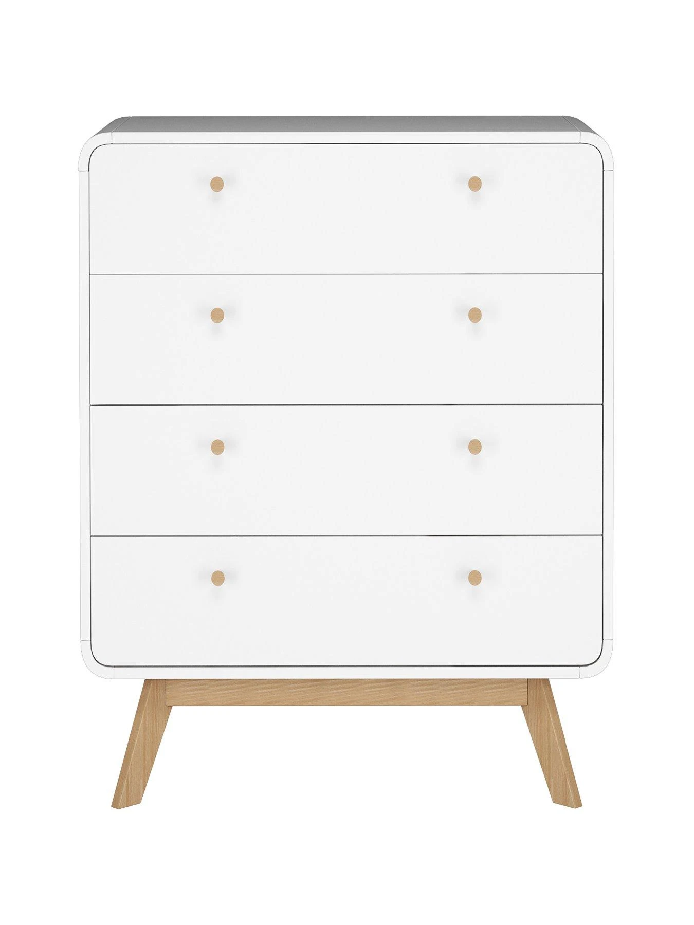 A contrasting oak-effect base is rich in a realistic grain pattern, while splayed feet give it the eye-catching Scandinavian vibe and raise it off the floor. Four drawers are accented with dainty oak knob handles and glide smoothly open with a minimum of friction or noise on the metal rail runners.