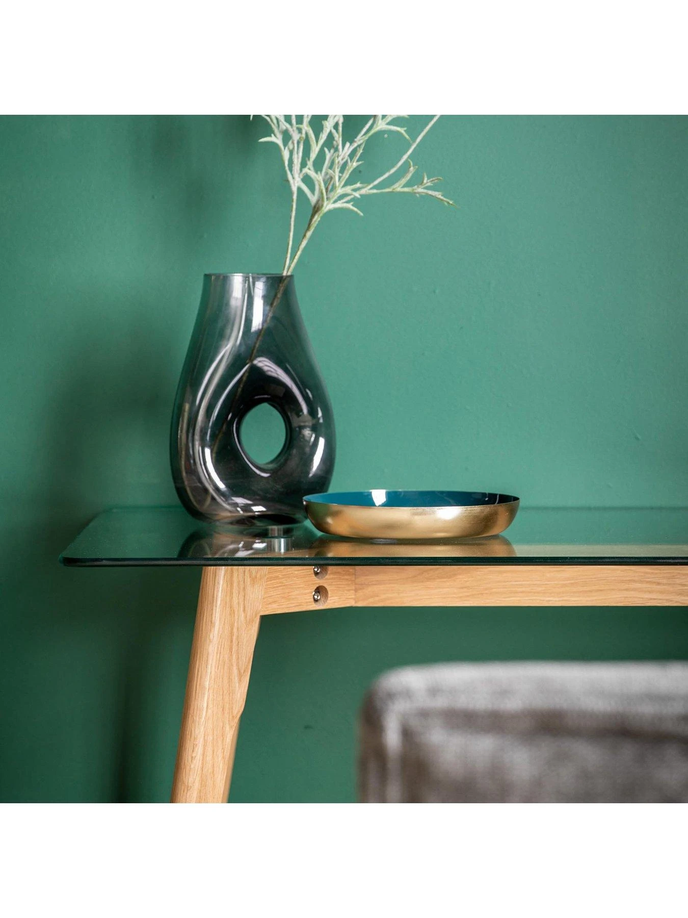 In a contemporary natural shade which will go with any colour scheme in your home office, the desk has a slimline solid oak base with splayed legs for a Scandi-inspired vibe. The top is made from a clear tempered glass with smooth rounded corners and measures 1 metre across to provide plenty of work space.