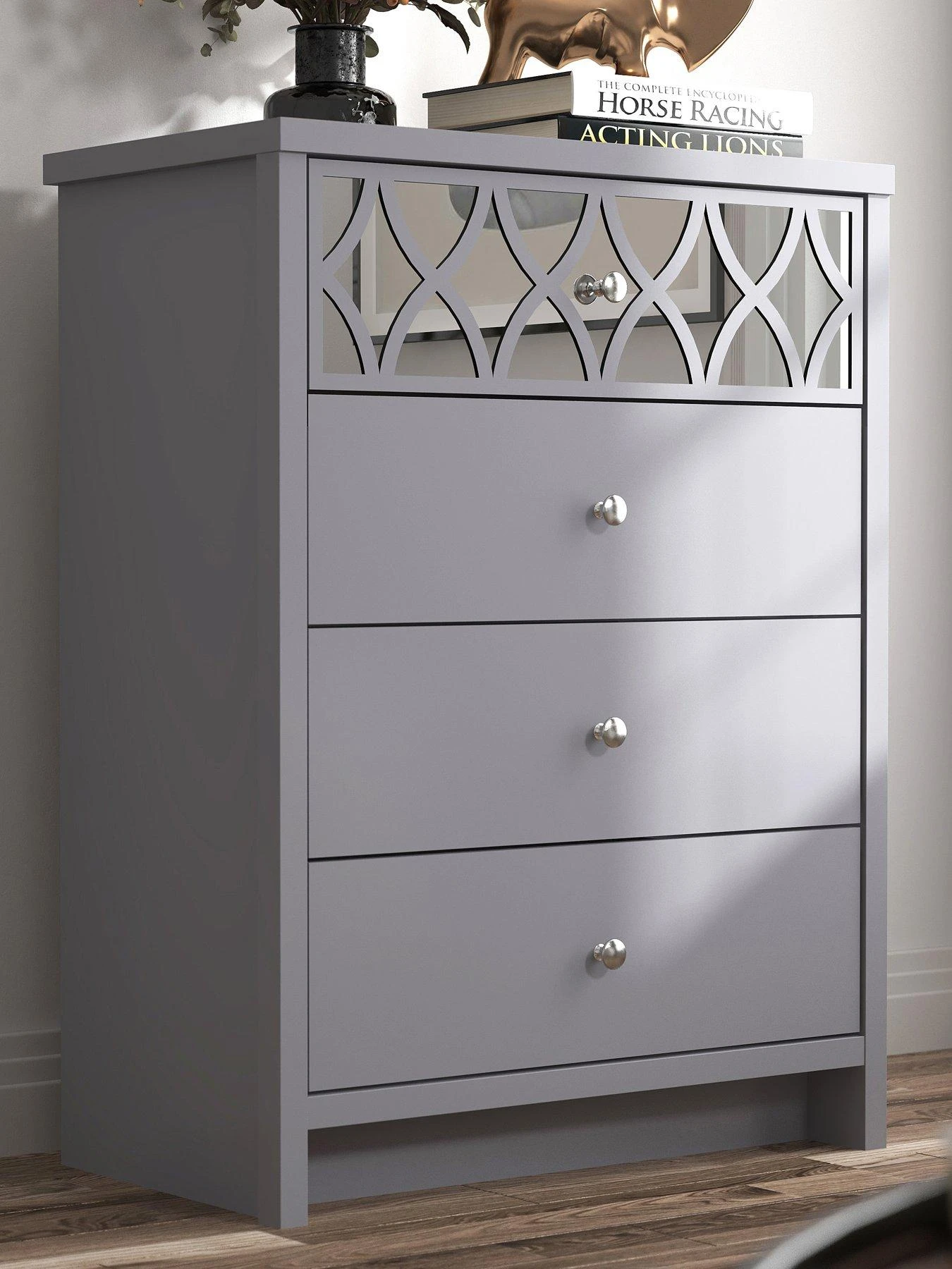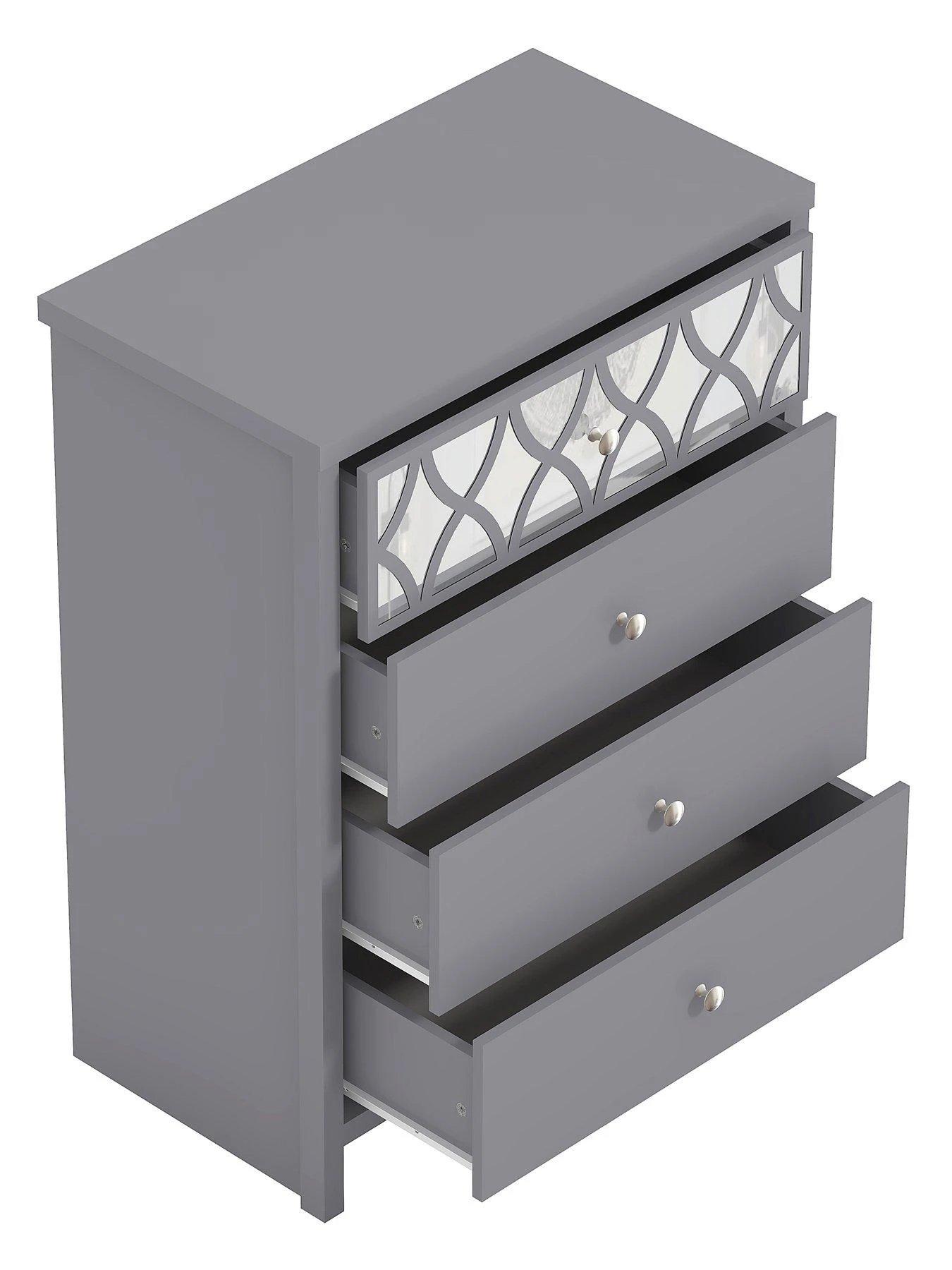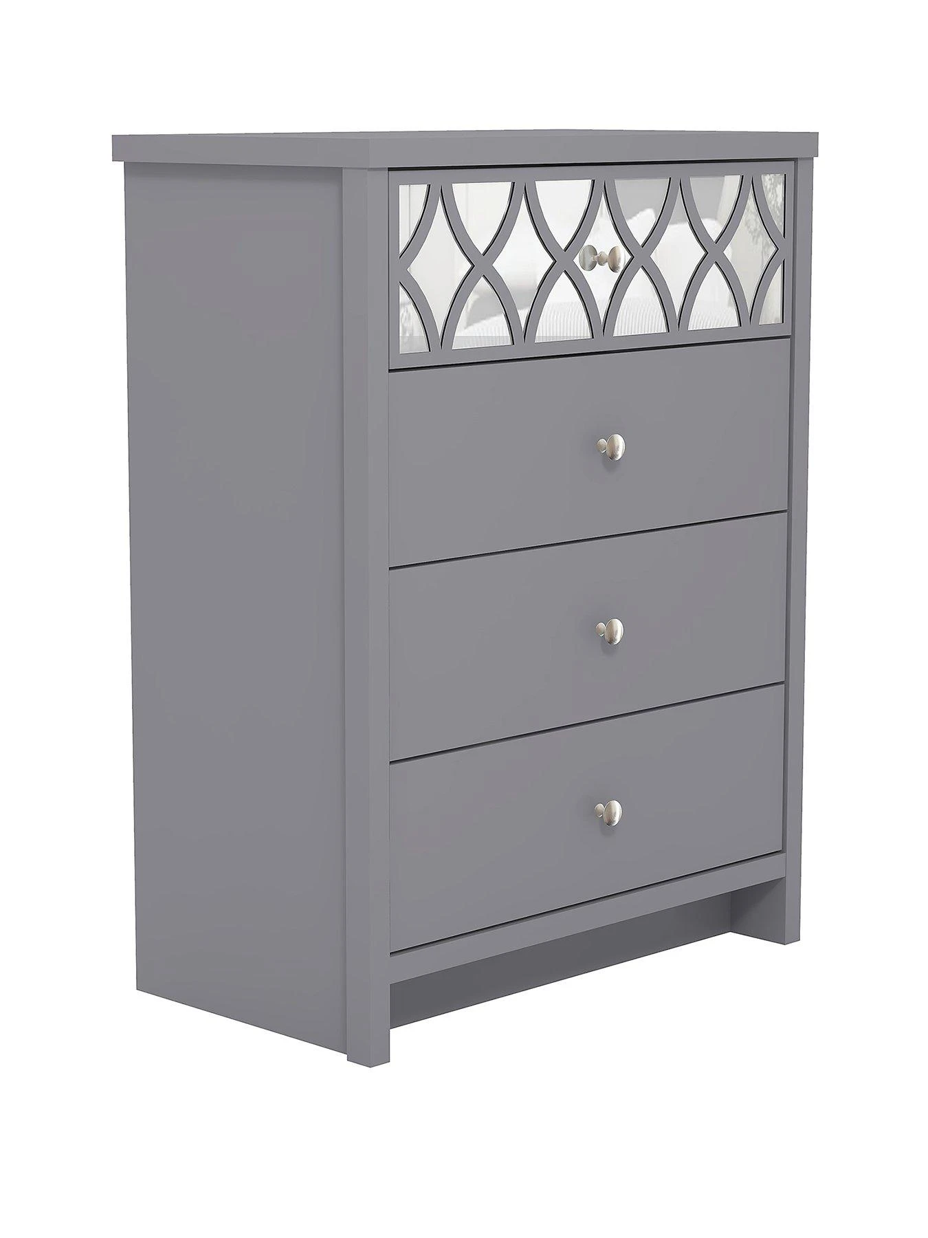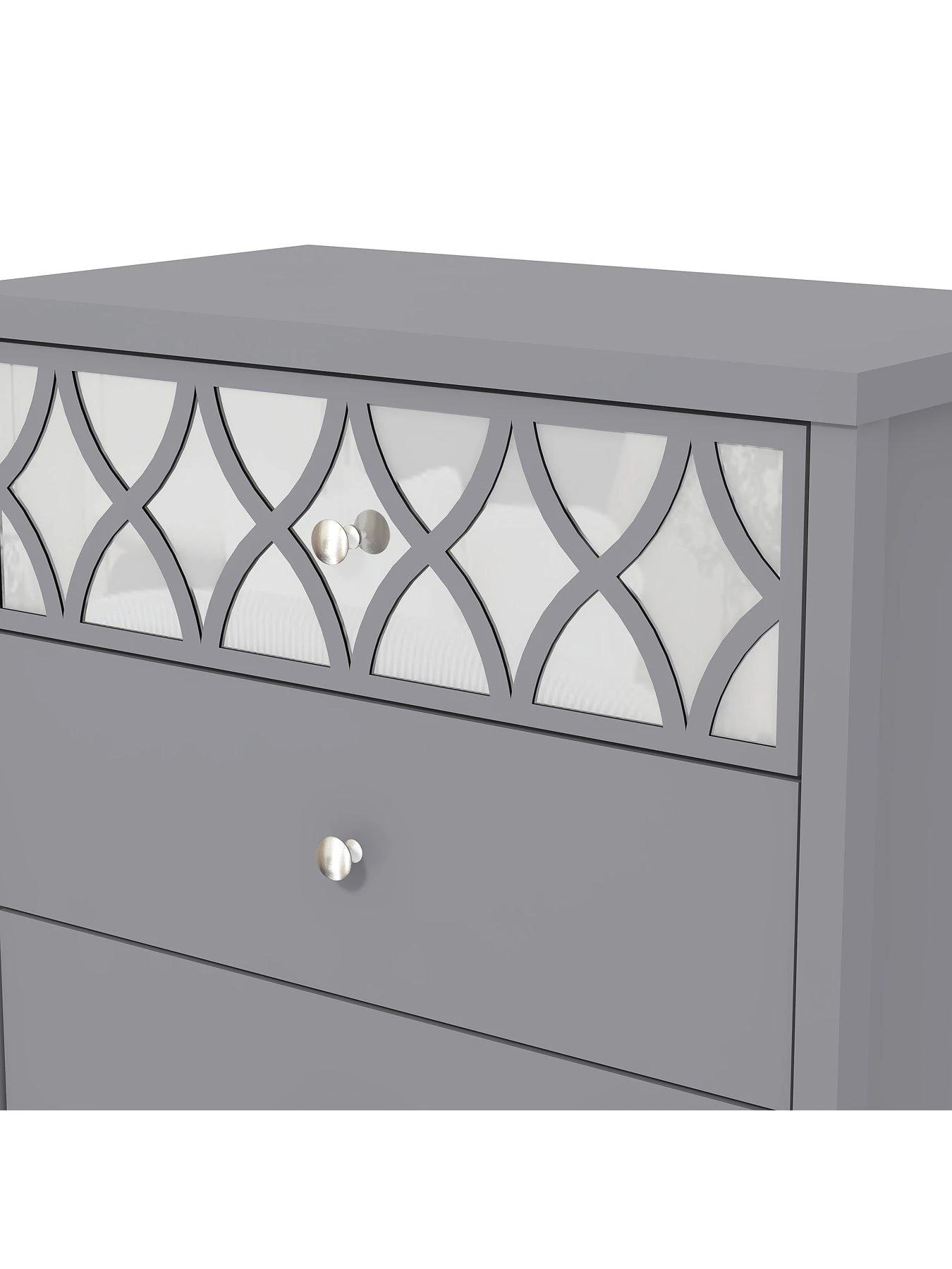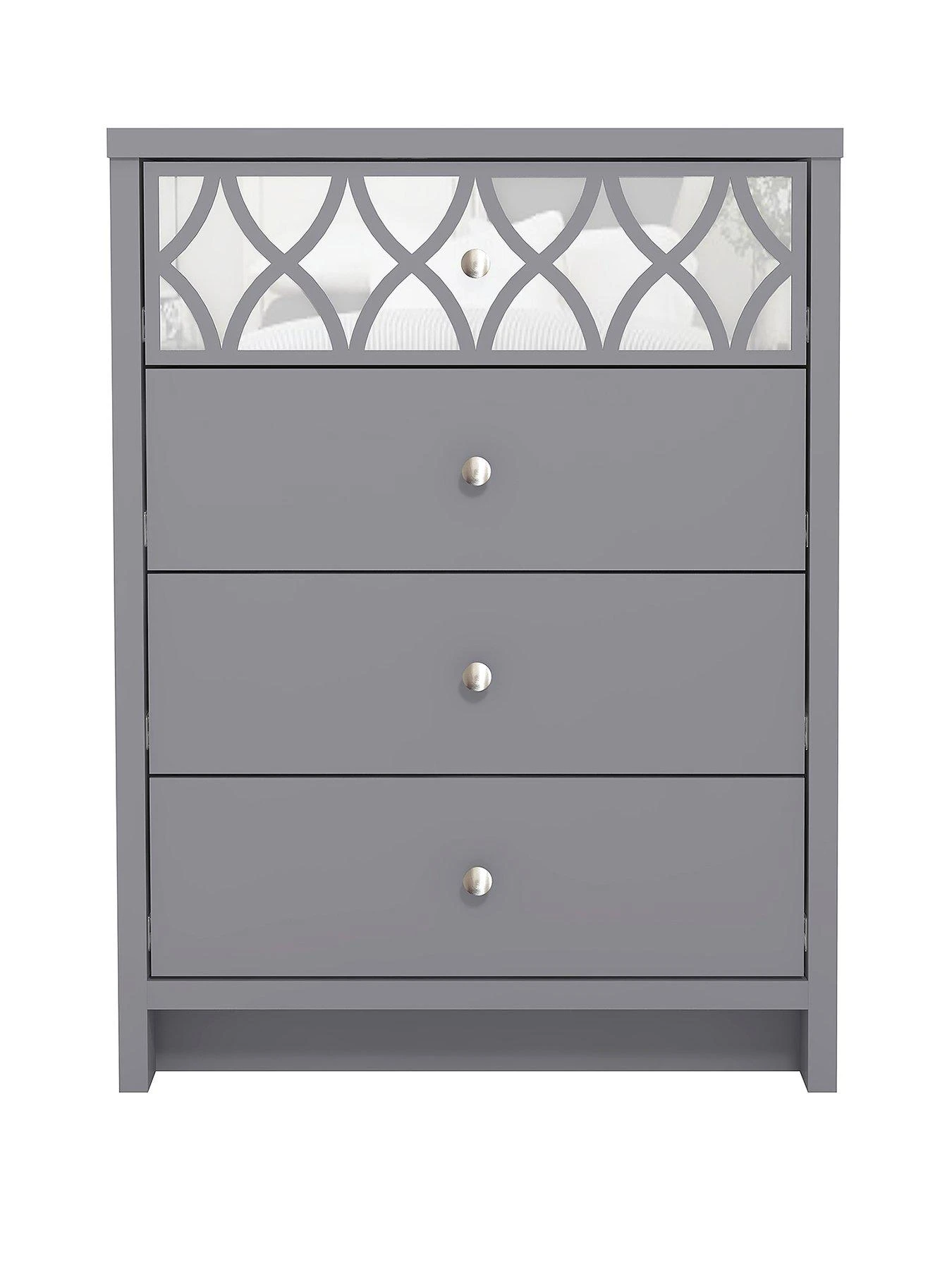 Stunning in a soft and neutral choice ofĀ grey or white,Ā the top drawer catches the light (not to mention the attention)Ā with aĀ reflective mirrored backdrop that’s enhanced with curvyĀ trellis overlay.