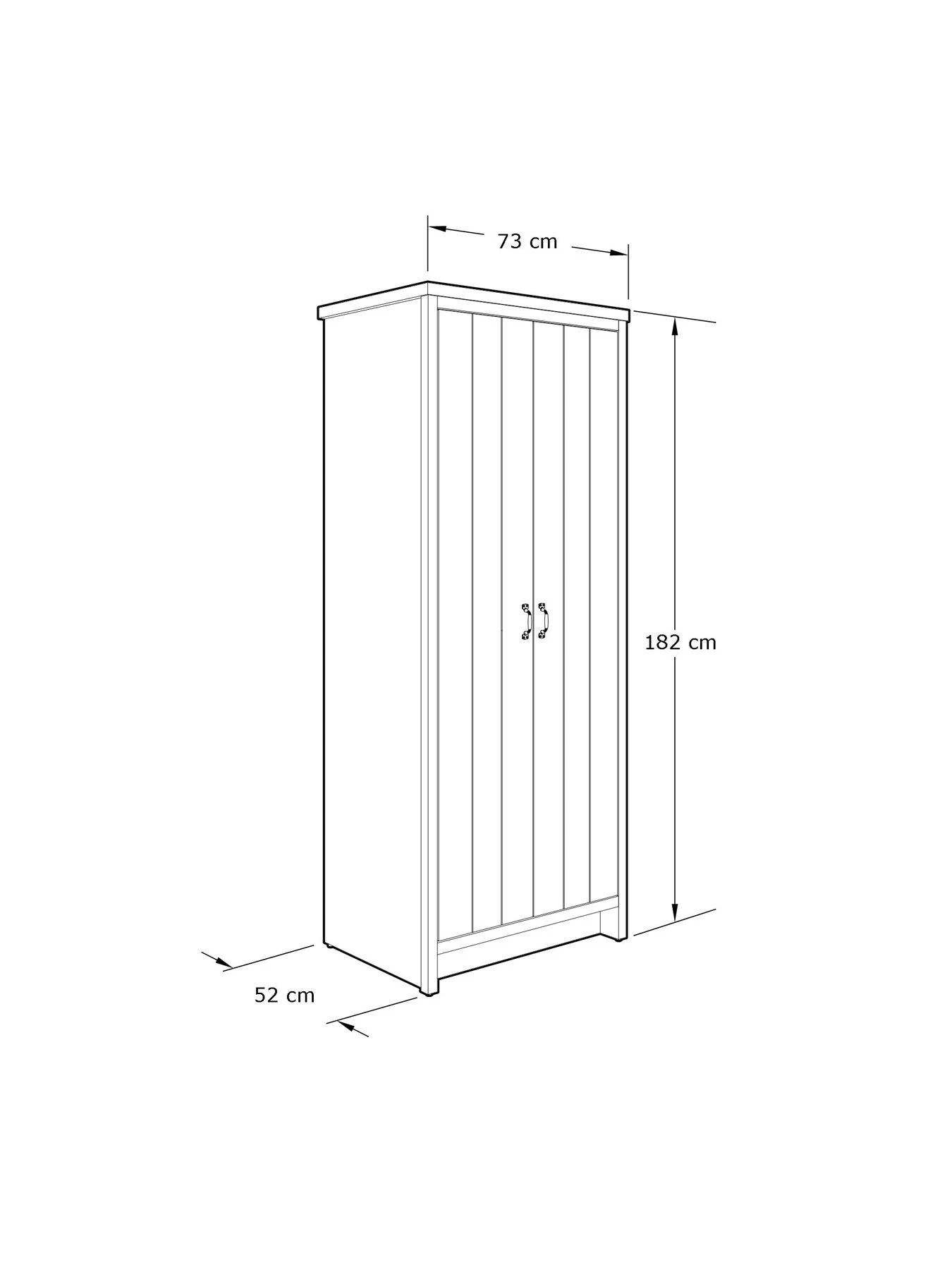 Finished with metal handles, it contains a metal hanging rail and high shelf, while adjustable metal hinges allow for easy alignment on uneven floors.