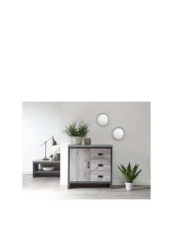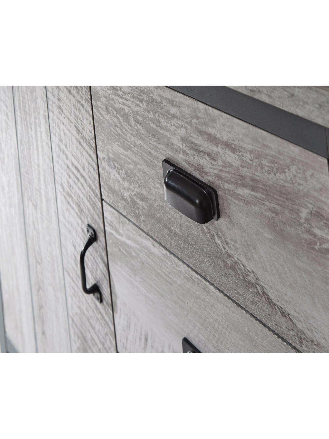 It gets its industrial style from a grey wood-effect to the fronts and sides that’s been given a distressed finish.