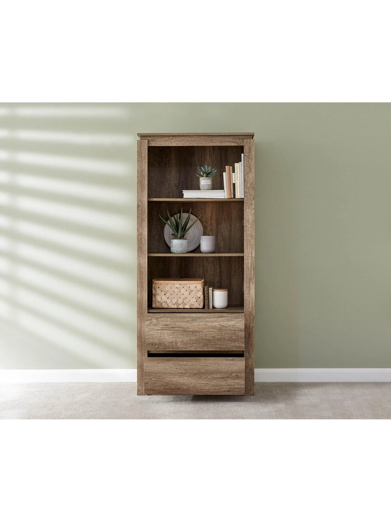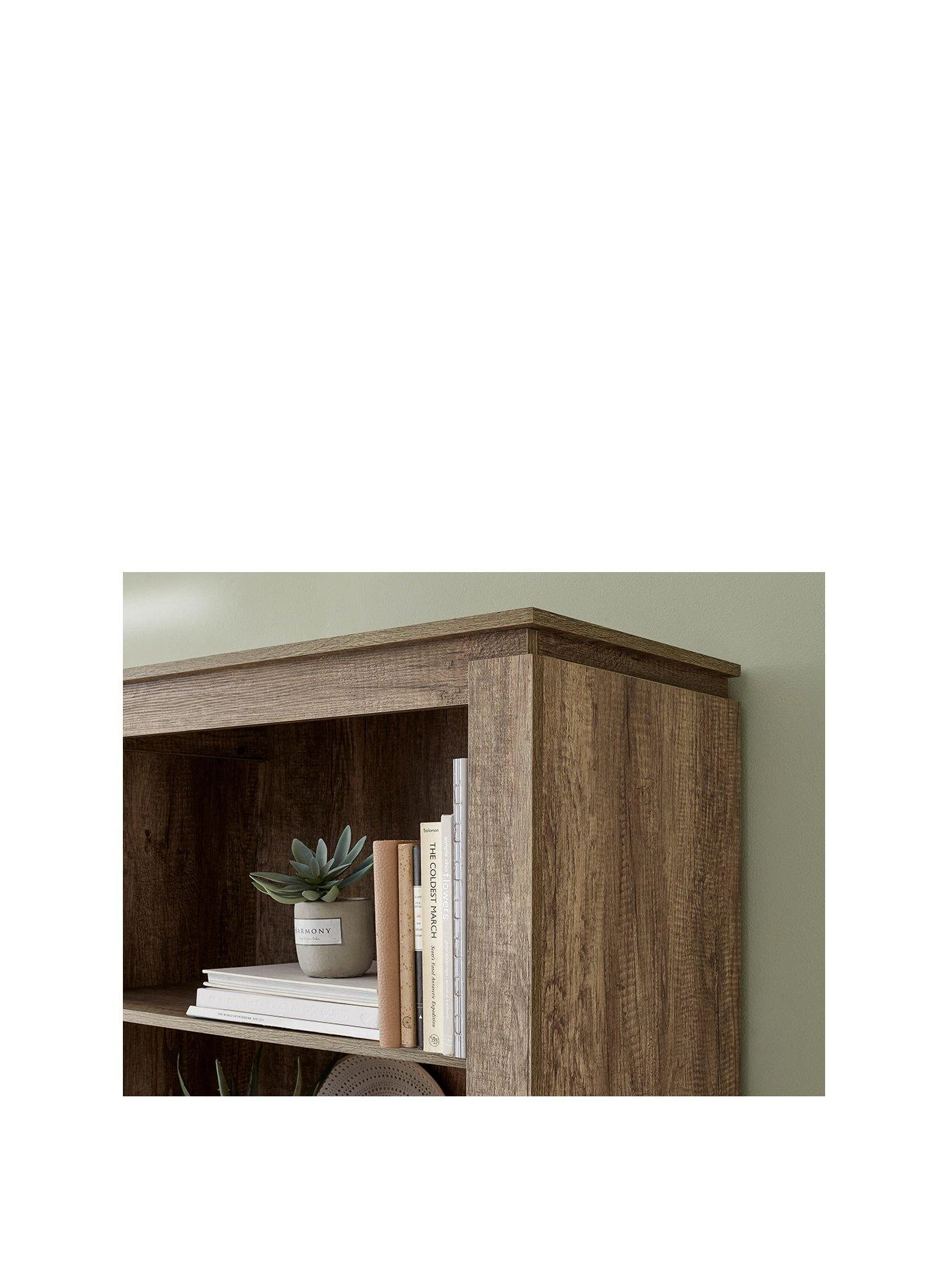 Its rustic oak-effect has a stunningly realistic 3D grain detail which flaunts a range of rich colour tones. Random saw marks add to the authentic appearance, ensuring your favourite books and decorative pieces are smartly surrounded.