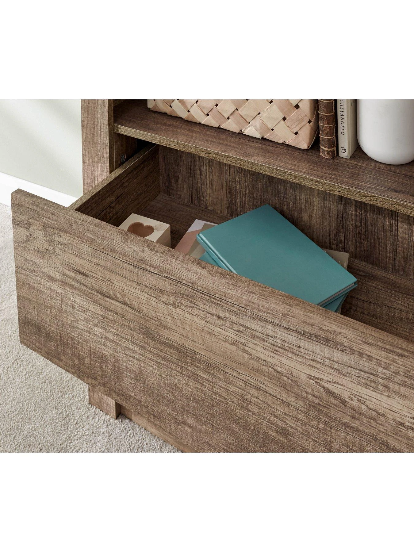 The shelves are complemented by a pair of storage drawers which provide a handy hideaway for clutter, while metal runners ensure a smooth, fluid action. The handle-free design allows the wood look to take centre stage.
