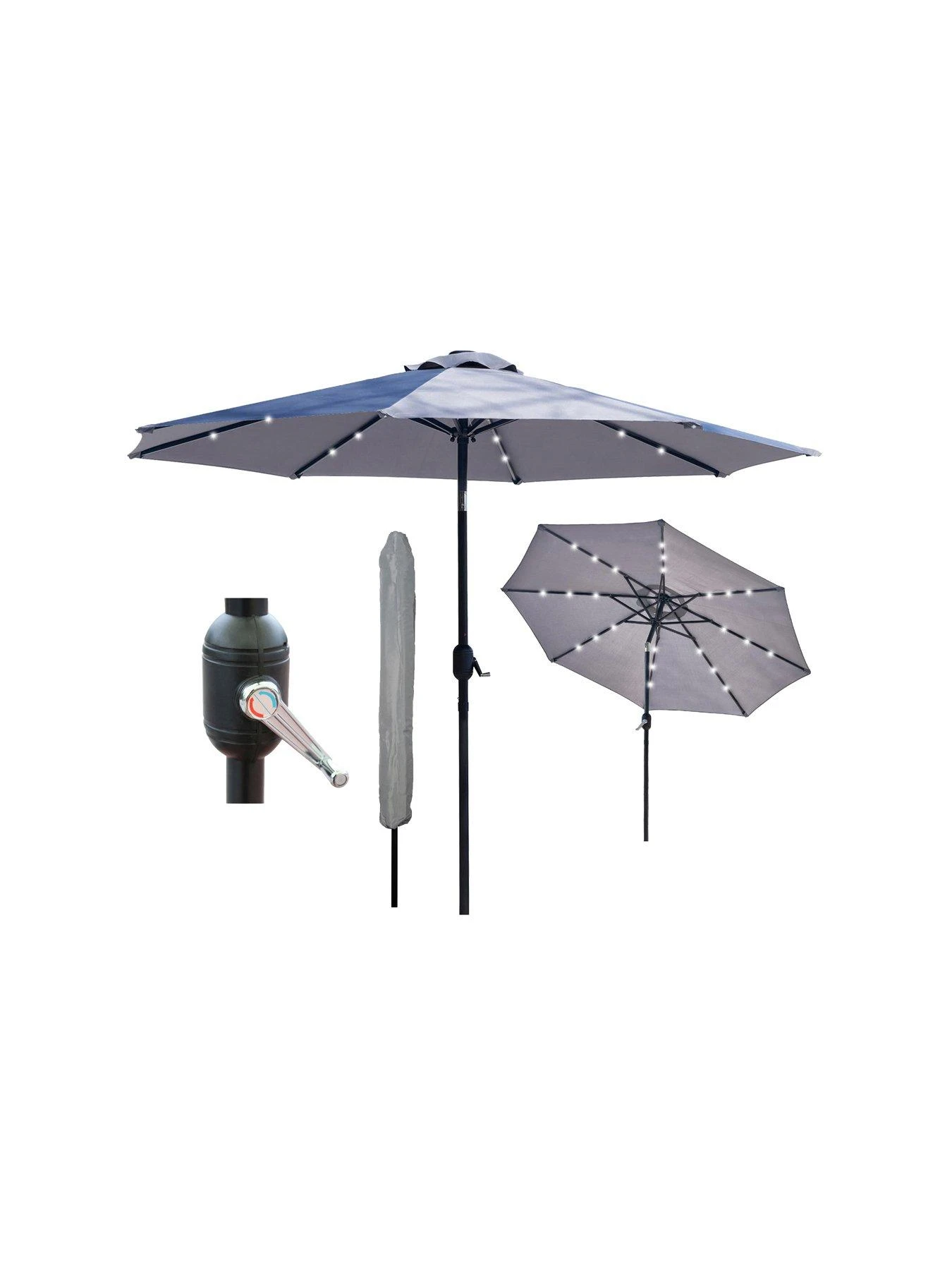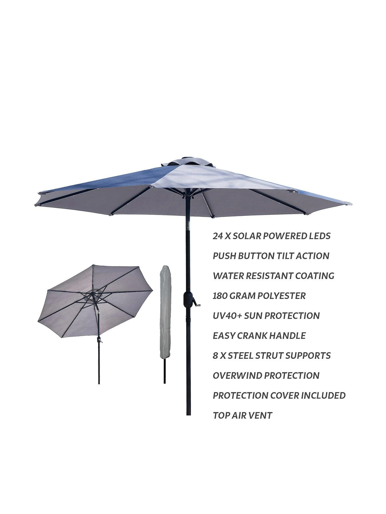 GlamHaus Solar LED Tilting Light Grey Garden Parasol Umbrella 2.7M with Crank Handle, UV40+ Protection, Includes Protection Cover – Robust Steel