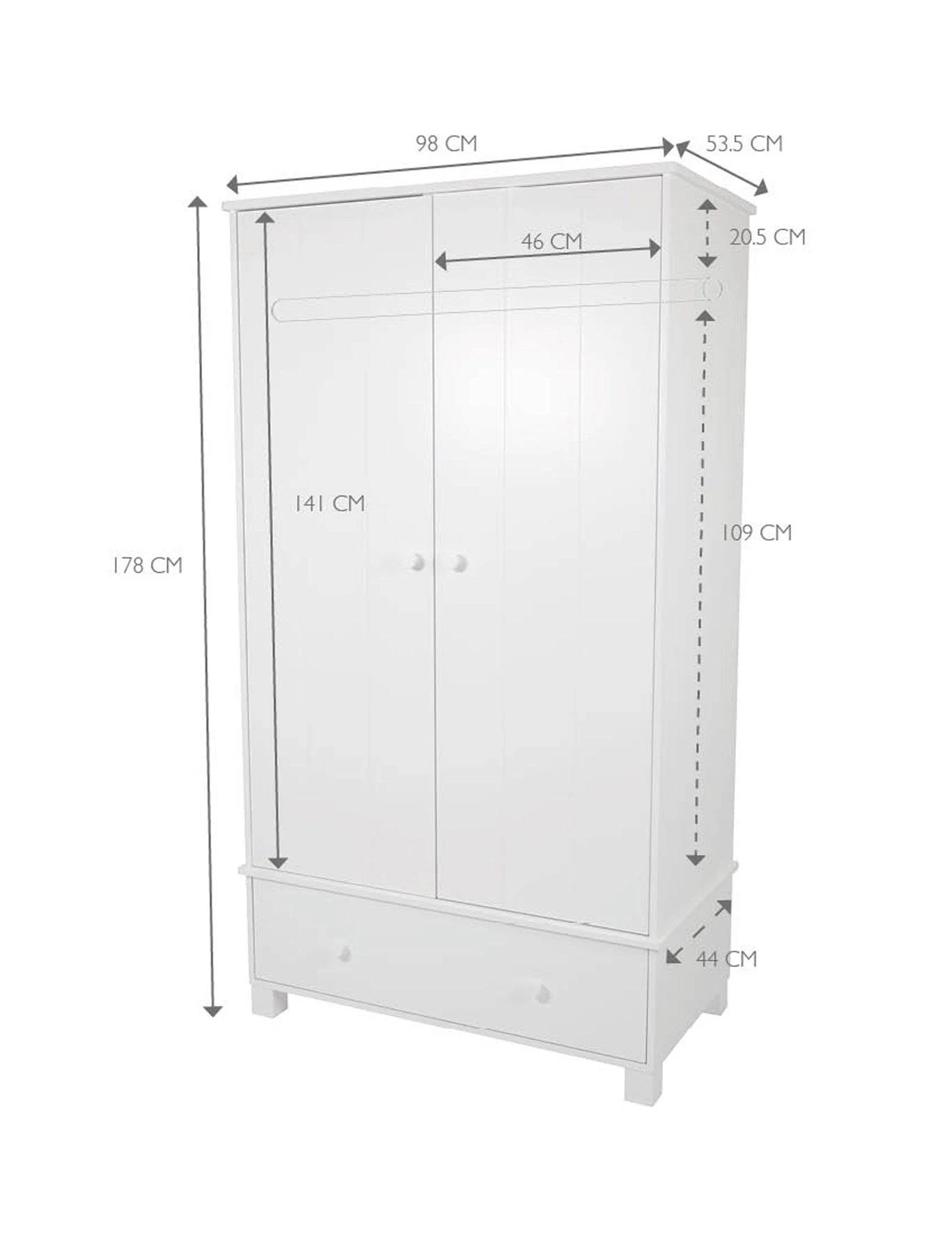 Specially designed to grow as your child does, the space inside can be adapted thanks to the handy hanging rail which can be fitted at three different heights to suit your child. There’s also a height shelf for added storage that can be removed when extra hanging space is needed. The single drawer is ideal for folded clothes, toys, games and so much more, and sits on metal runners for an easy-glide action.