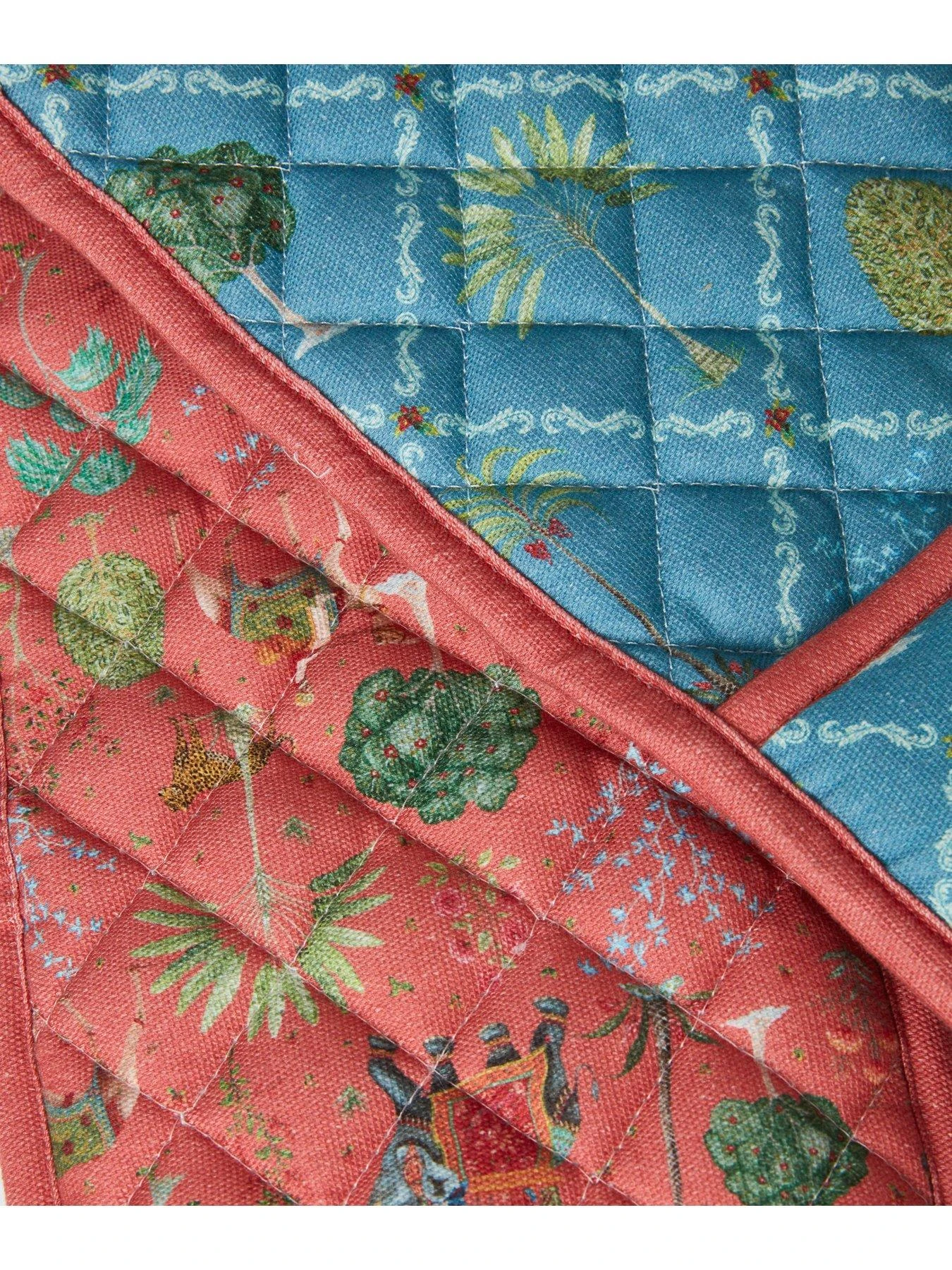 Its coral and blue colourway is bold and full of boho charm, and it’s brought to life by a vintage-style tropical print featuring palm trees, elephants, camels and more. Quilted stitching helps to keep the polyester filling in place, so your hands will be safe from burns when taking hot dishes out of the oven.