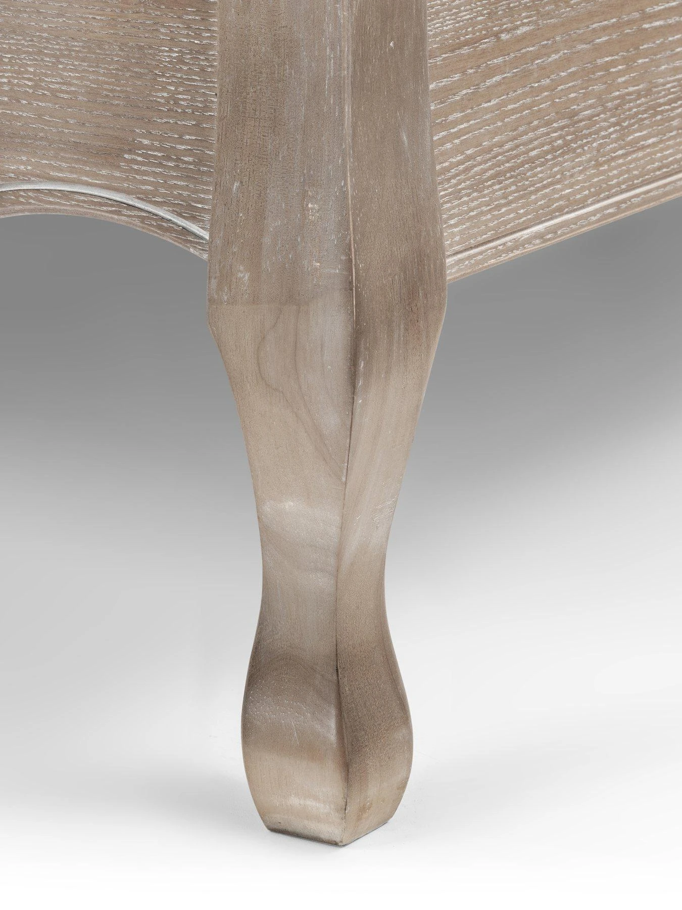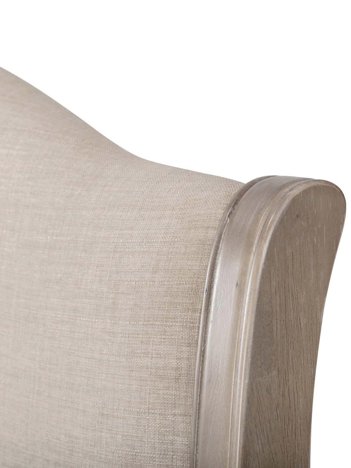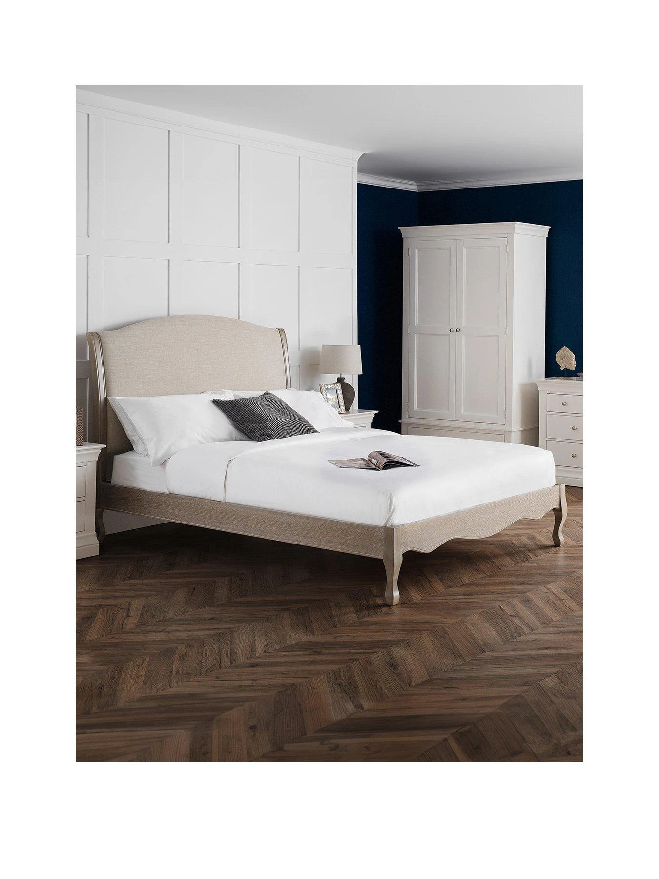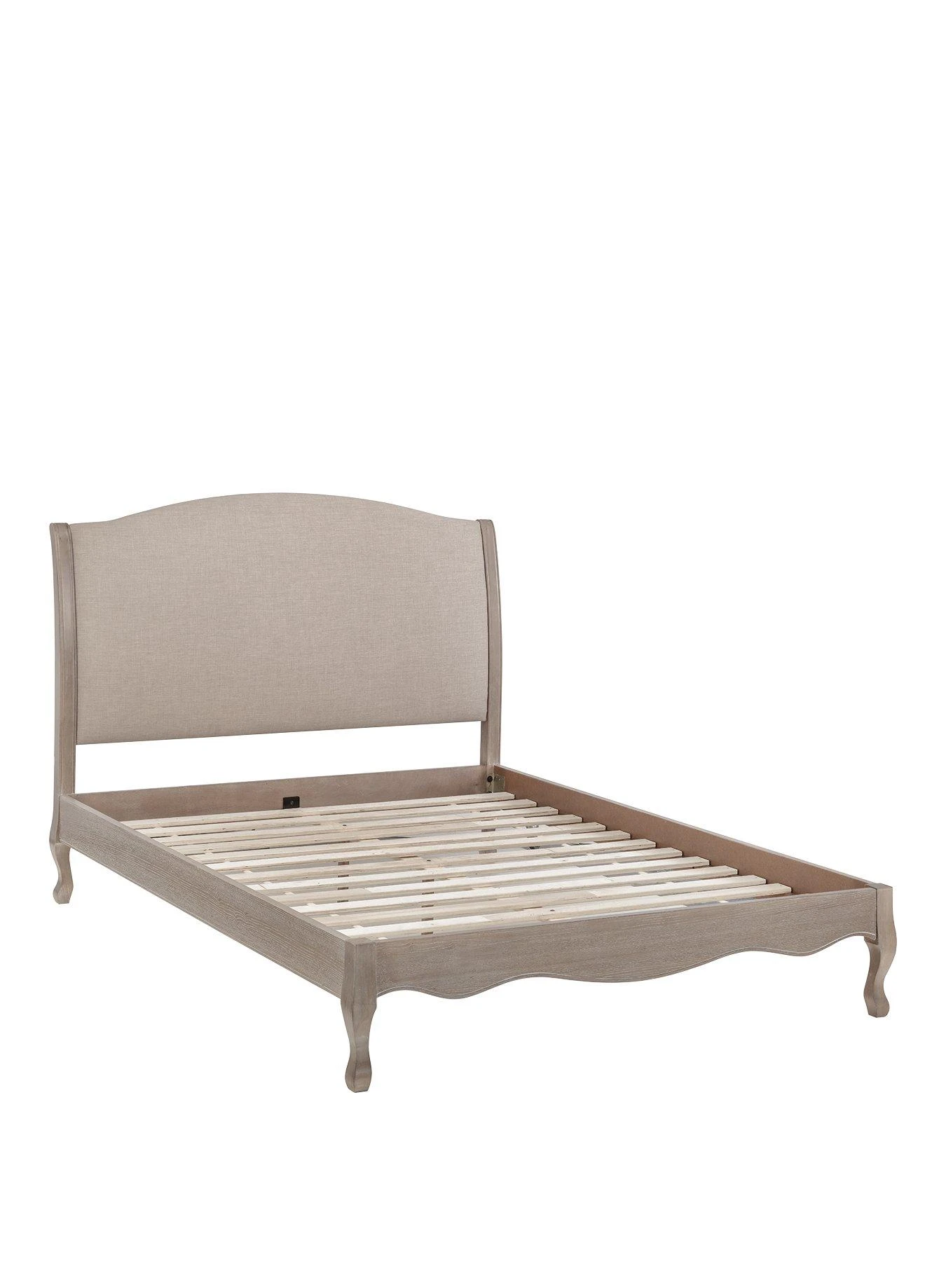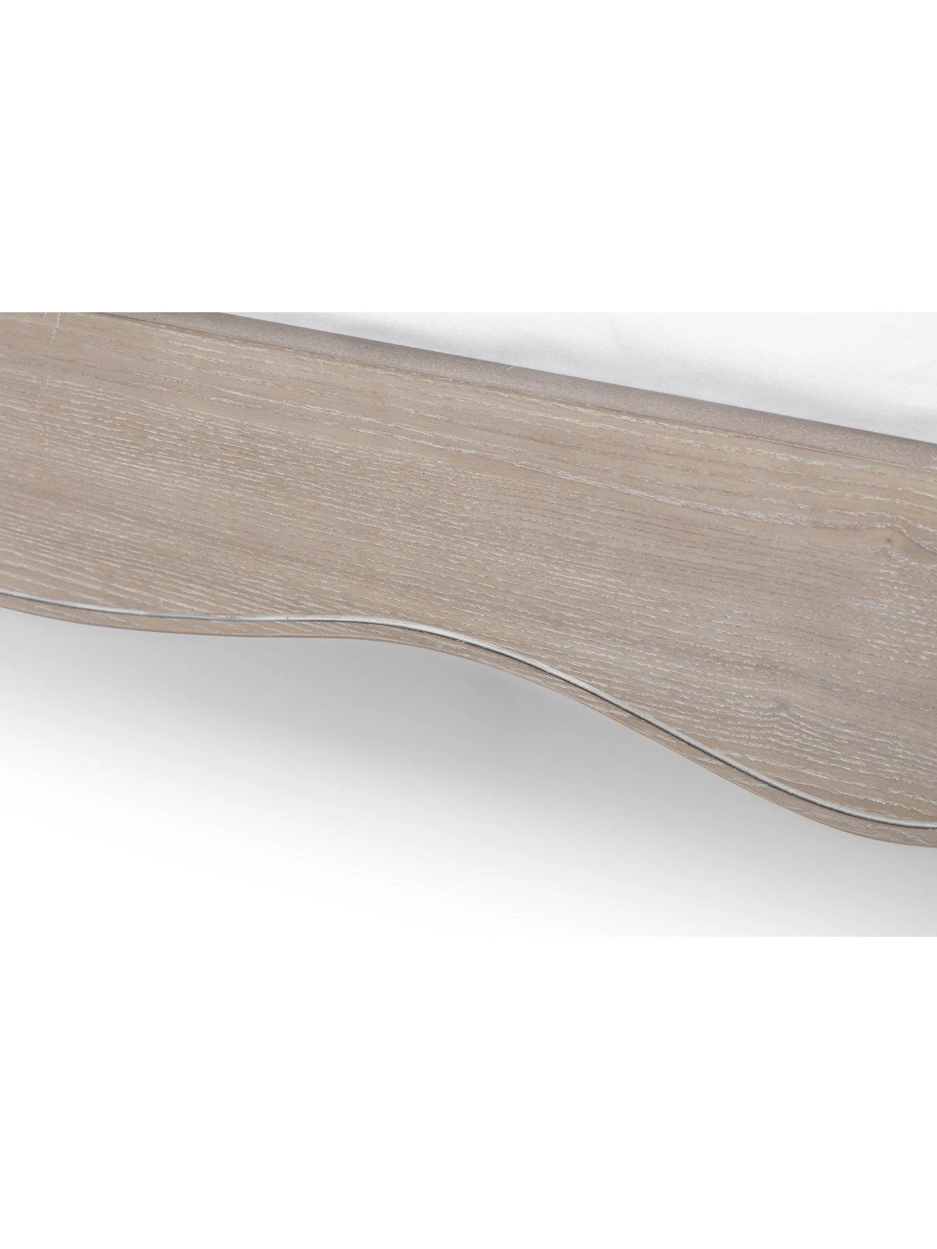 The frame is crafted from solid wood in a limed oak-effect finish. Its ornate shape exudes elegance with curved legs, headboard supports and scalloped footboard. The headboard contrasts in a soft oatmeal coloured linen fabric which covers soft, comfortable padding – perfect for resting against when sitting up in bed.