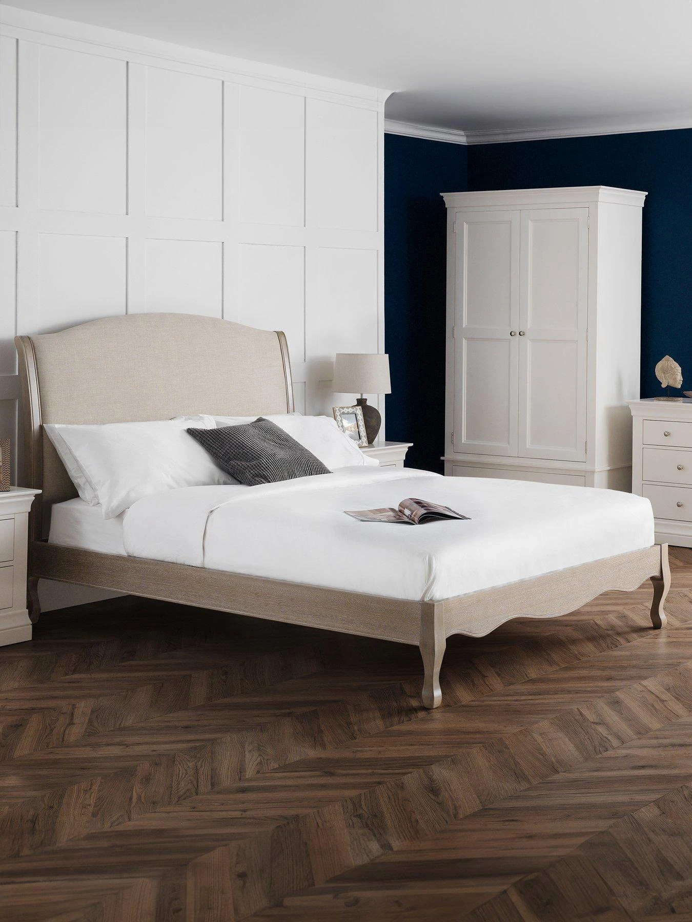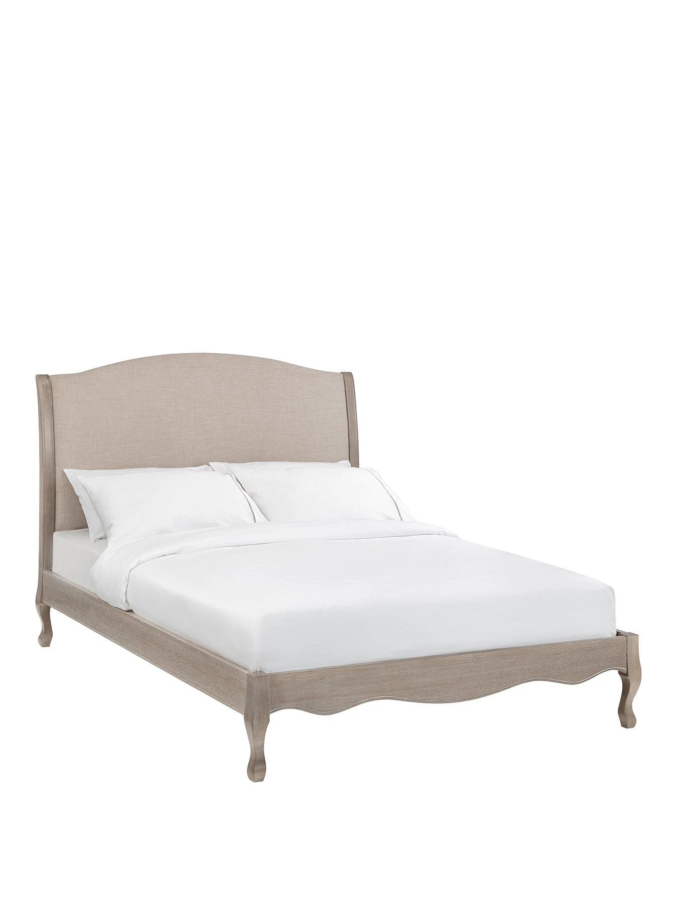 - Limed oak frame with an upholstered linen headboard.