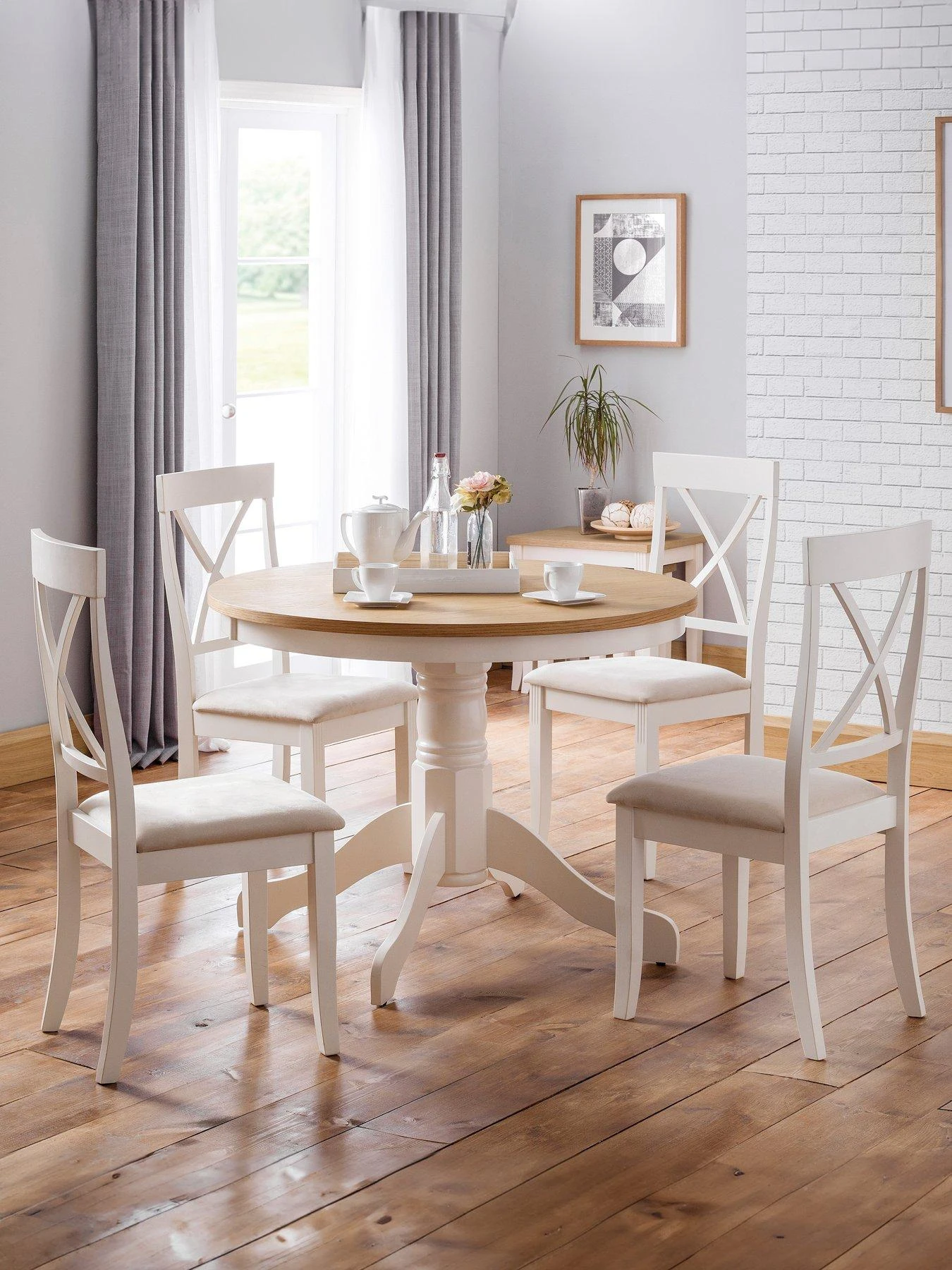 This elegant dining table from Julian Bowen’s Davenport collection boasts a 25mm real oak veneer circular top. This has been lightly oiled for protection and to coax out the detail of the grain. This is supported by a classic chunky pedestal base with a turned design and curved legs that are finished in a soft ivory lacquer.