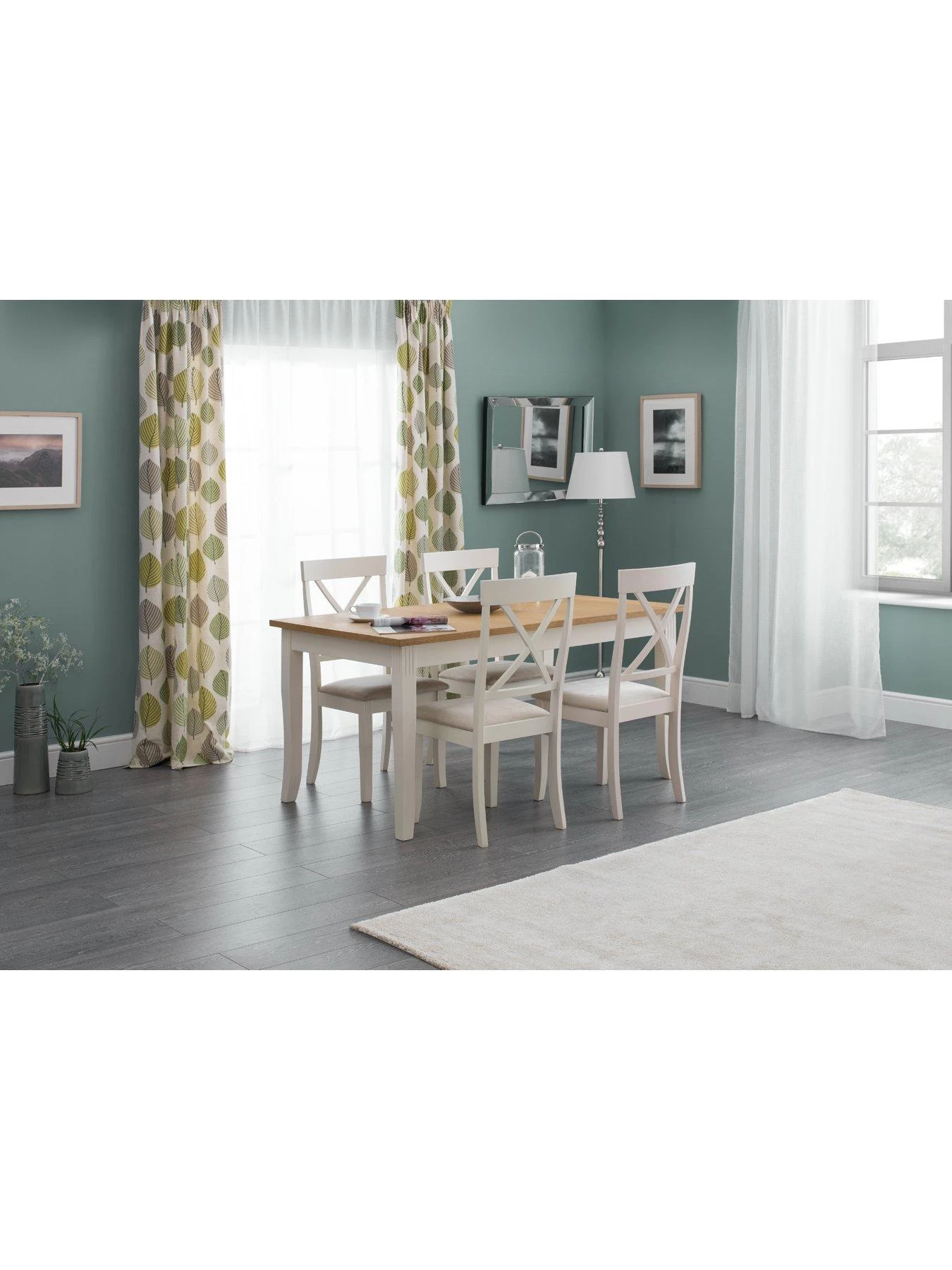 This elegant dining table from Julian Bowen’s Davenport collection is crafted from a solid rubberwood base in an ivory finish. This supports a real oak veneer 25mm thick top, which has been lightly oiled for protection and lustre.