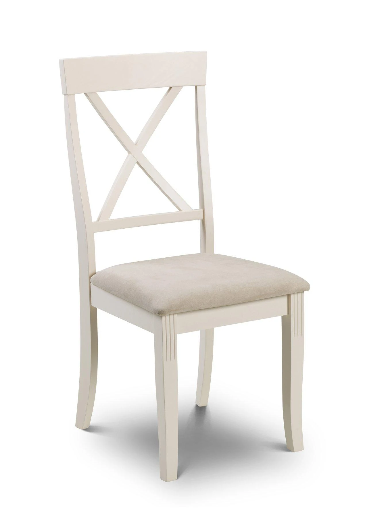 The base and gently curved legs contrast in an elegant ivory lacquer, while 4 matching cross back chairs feature padded seats with a soft faux suede upholstered finish.