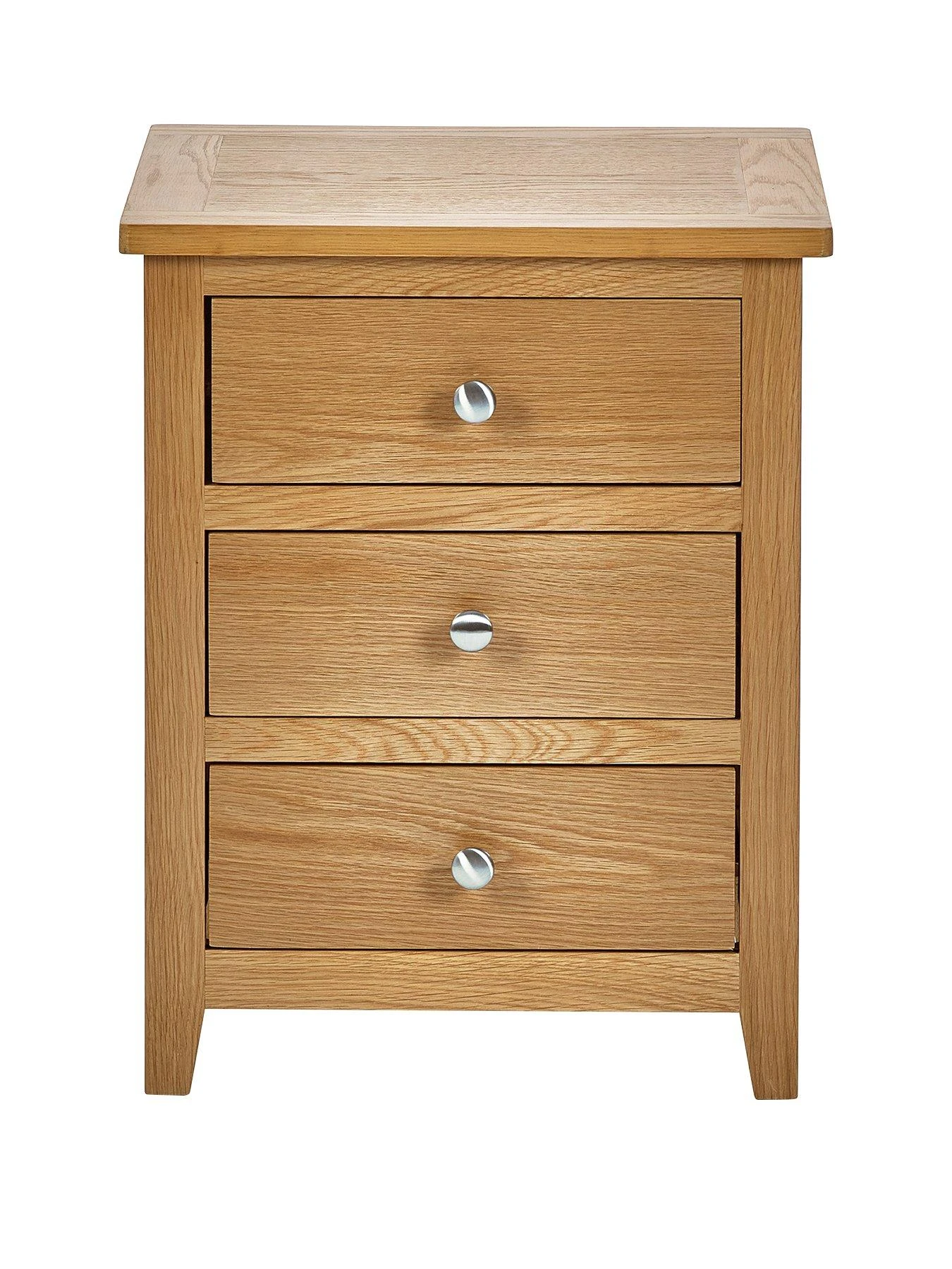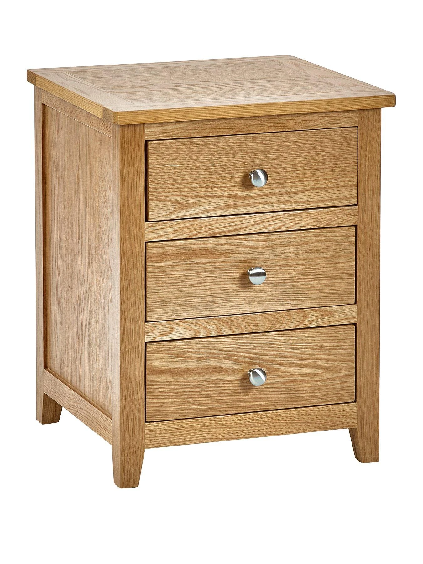 The Mallory 3 Drawer Bedside, crafted from solid oak and oak veneers, features 3 spacious drawers perfect for storing those items needed at hands reach from your bed. The simple, yet stylish design with beautiful silver knobs perfectly complements any bedroom decor.