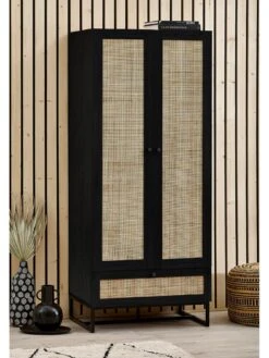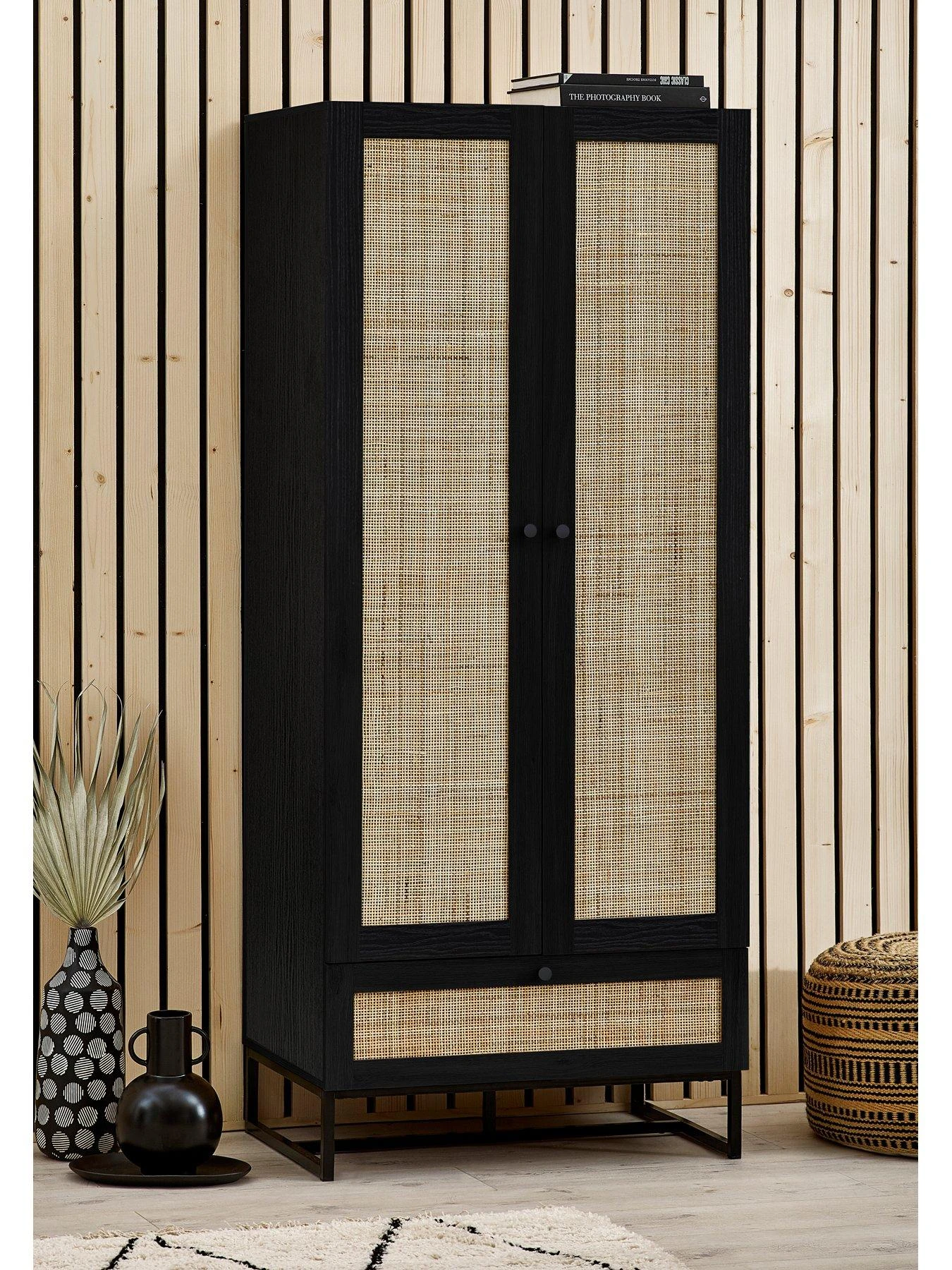 You can pick either oak or grained black to suit the colour scheme of your space, and each one features breathtaking rattan panels to the doors and drawer front. The natural rattan gives the furniture a unique and airy appearance that contrasts stunningly against the industrial-inspired metal base.