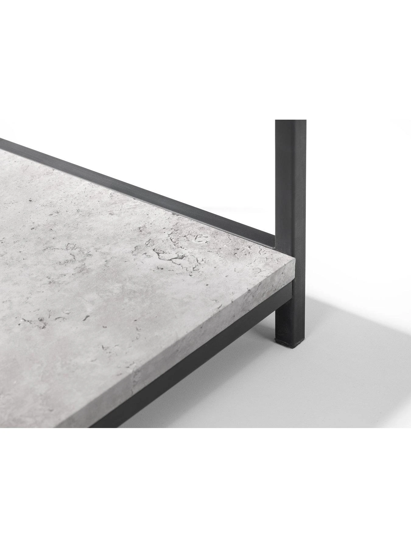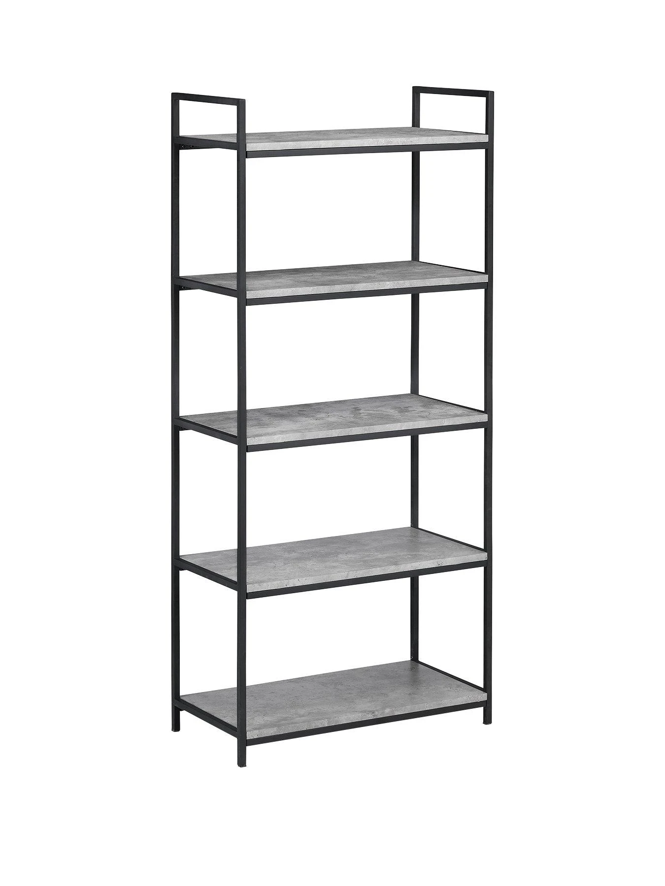 Five shelves flaunt a contemporary concrete effect foil finish, and the industrial look is enhanced by the black coated metal frame.