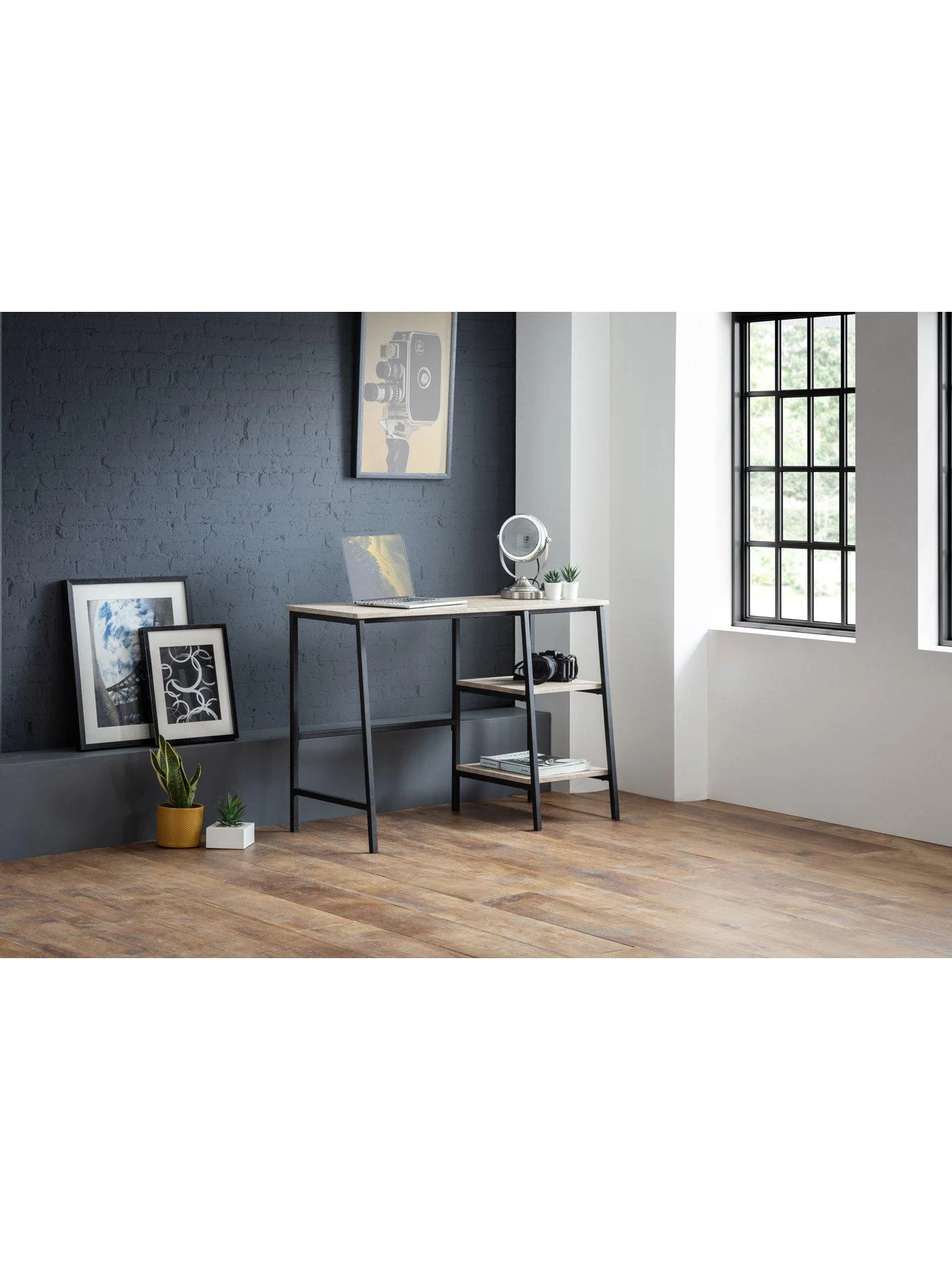 A cool, modern desk designed to add a contemporary touch to any living space. Its simple clean lines, delineated by a subtle, black coated metal frame are complemented perfectly by a warm, sonoma oak foil, to create a very stylish and sleek product. This desk features 2 shelves on the right hand side, suitable for stationary storage.
