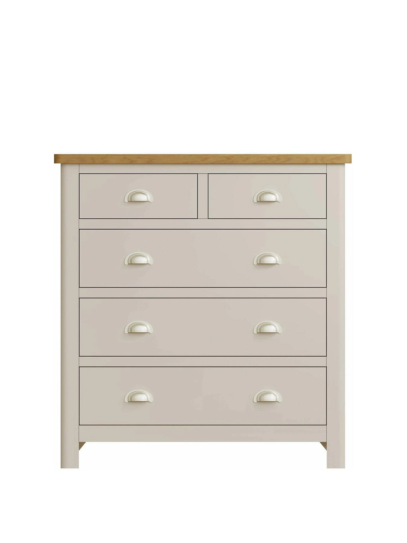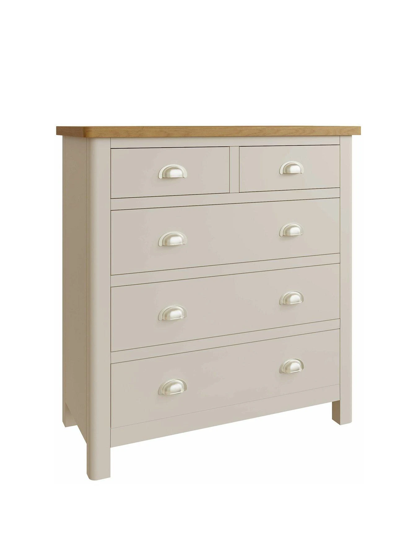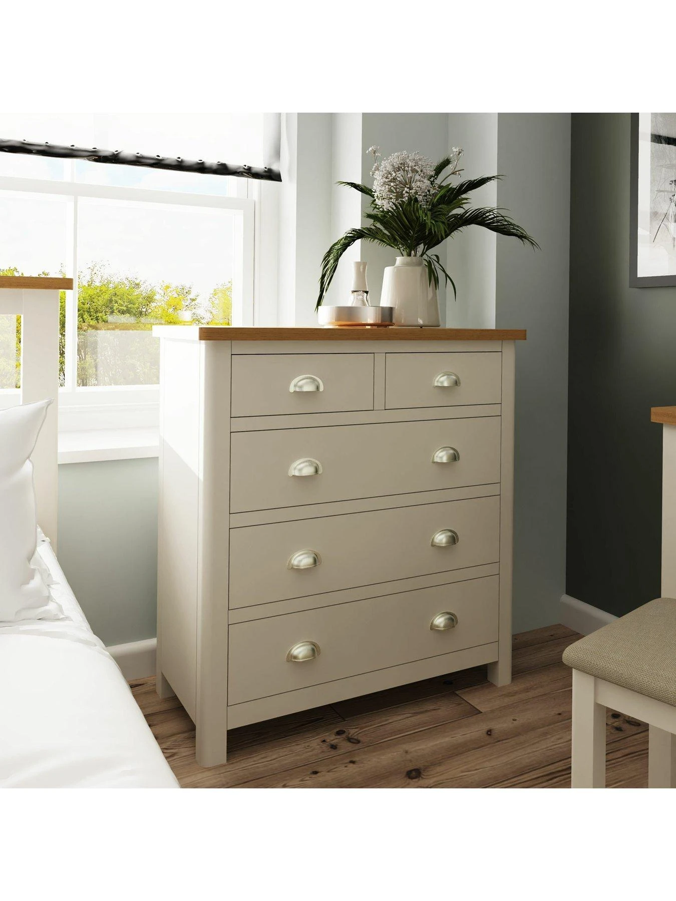 Featuring five drawers to help organise your sleep space, it’s made from solid wood in a smooth dove grey painted shade that will go with any style of bedding and decor. The natural oak top creates an eye-catching contrast, while large brushed chrome effect cup handles add an accent of shine.