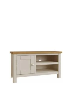 Crafted from solid wood in a smooth dove grey painted shade that will go with any style of decor, the natural oak top creates an eye-catching contrast and is the perfect platform for your television.