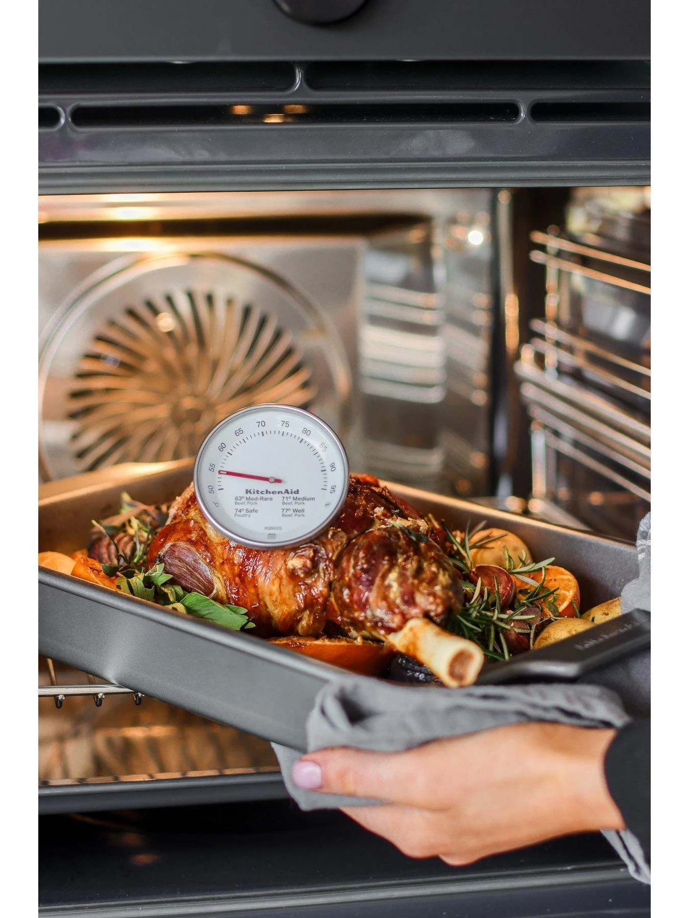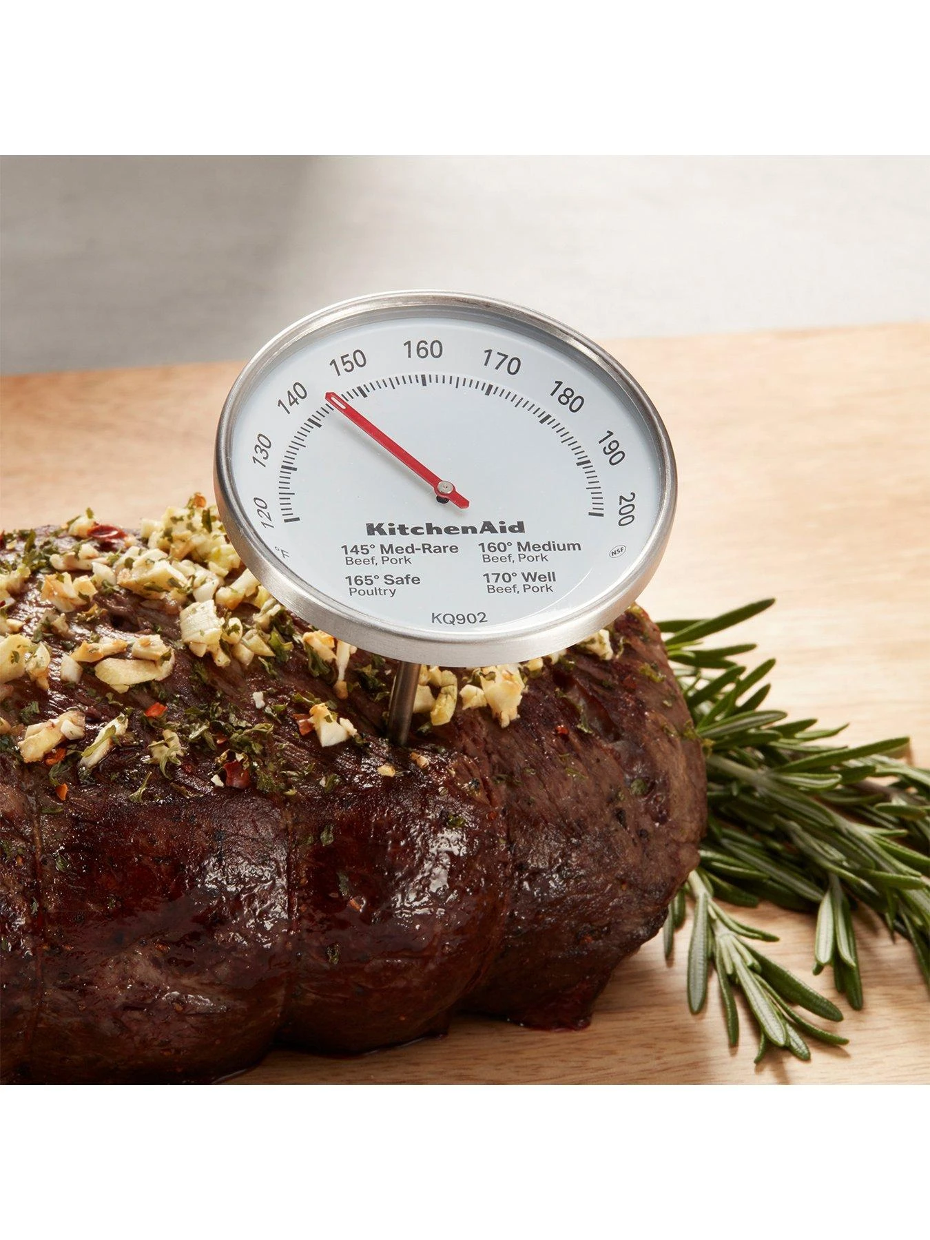 The KitchenAid leave-in meat thermometer is the only kitchen measurement tool that will help cook meat to the correct temperature and give peace of mind about food safety. The 7.5cm dial has a tempered glass lens that is safe to leave in the oven during cooking. The pointer will slowly move as the internal temperature of the roast or poultry rises. Full stainless steel construction is durable and long lasting. Cooking temperatures are printed right on the dial for quick reference. NSF listed. Important: Thermometer will be hot after use. Use oven gloves when handling hot thermometer. TIPS FOR USE: At room temperature, the pointer will rest at the bottom of the dial. If the piece of meat is colder than room temperature, the pointer will spin counter-clockwise into the number scale — the thermometer is not broken. Since this thermometer is meant to be left in foods DURING cooking, the pointer will not instantly move and will require a longer period of time to register the temperature.