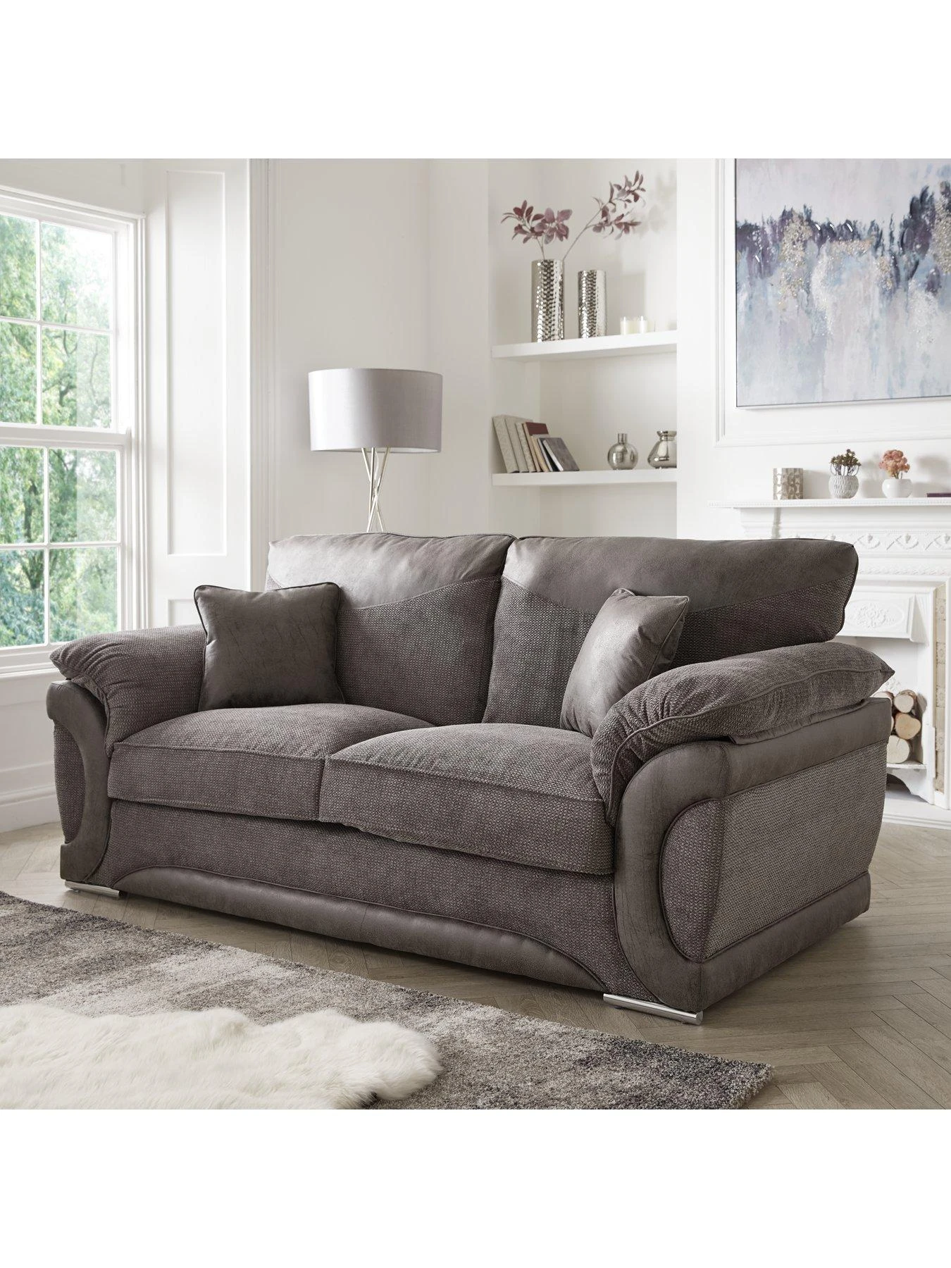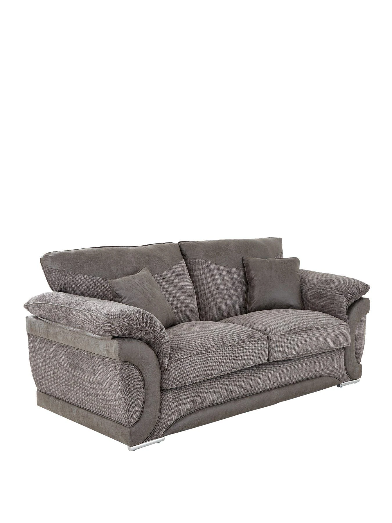 This stylish sofa suite features a bold blend of fabrics, as a heavily textured waffle upholstery contrasts against faux suede accents to the arms, fascia and back cushions. It’s available in a soft grey hue that will go with any style of existing decor, while shiny chrome bar feet finish the contemporary look.