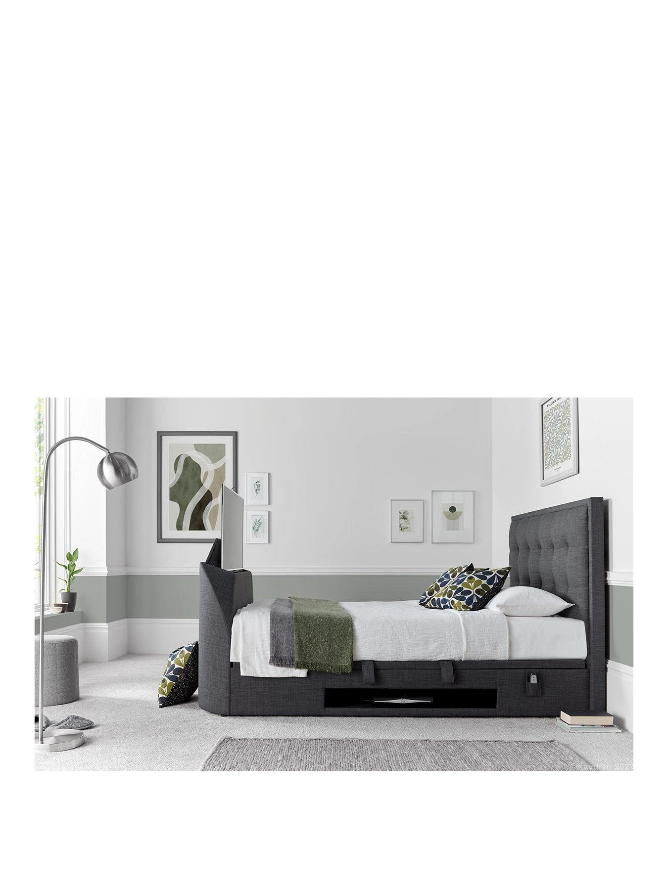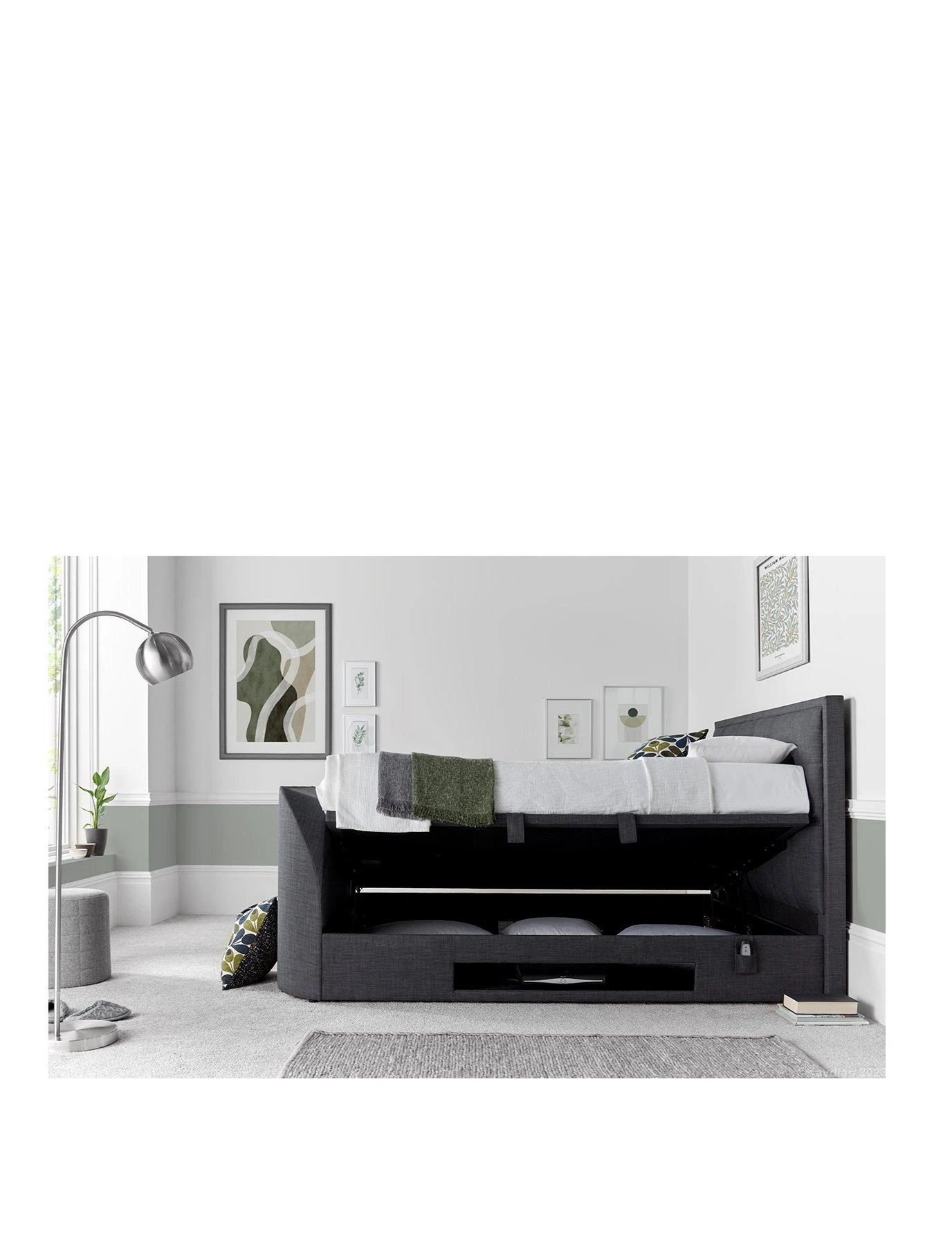 Woven fabric comes in dark grey or light grey, and it features a padded headboard with button detail. The base features a cubby for keeping your set-top box, video games console or DVD player, and it even helps you clear valuable space in your wardrobes or drawers thanks to the hydraulic-assisted lift-up ottoman base that reveals a roomy storage space.