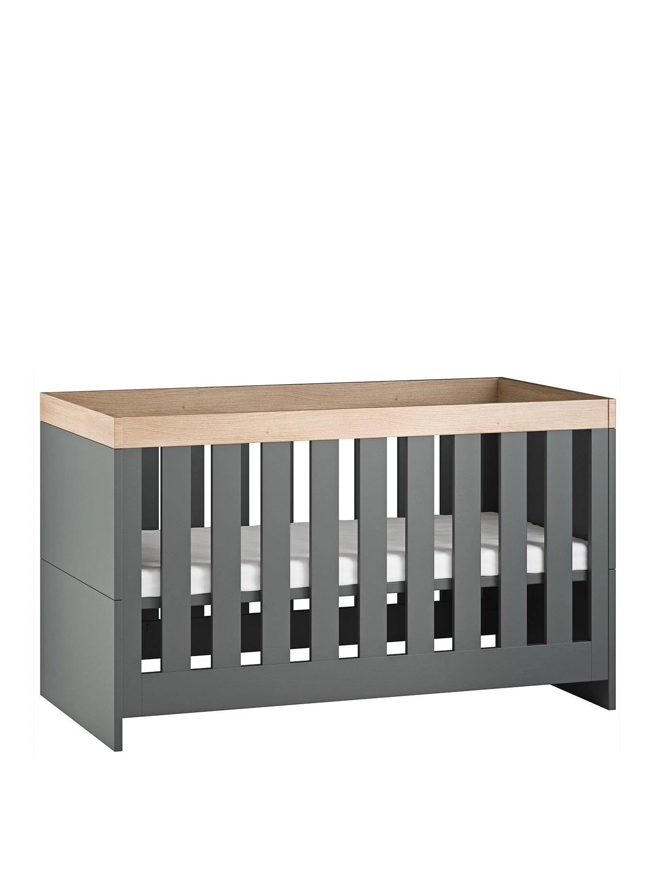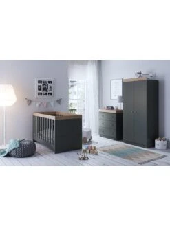 The Burlington Anthracite and Oak Cot Bed features stylish and modern Scandinavian-inspired designs with attractive oak accents. This cot bed is designed for your child (and you) to enjoy a good night’s rest. A substantial construction, it fits in any modern or traditional nursery, with its two-tone solid ends and chunky wide-slatted sides. The three-position base means it grows with baby too. The cot bed is suitable from birth to around four years. So once your child is old enough to go into a proper bed, the cot can be adapted into a toddler bed by removing the side rails, splitting the head and footboard.
