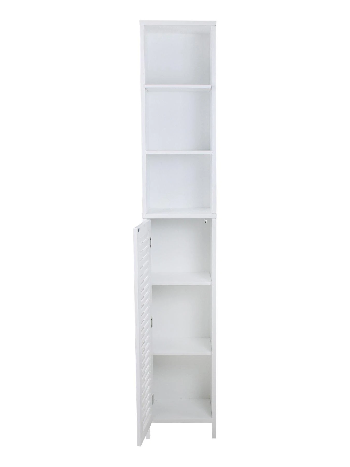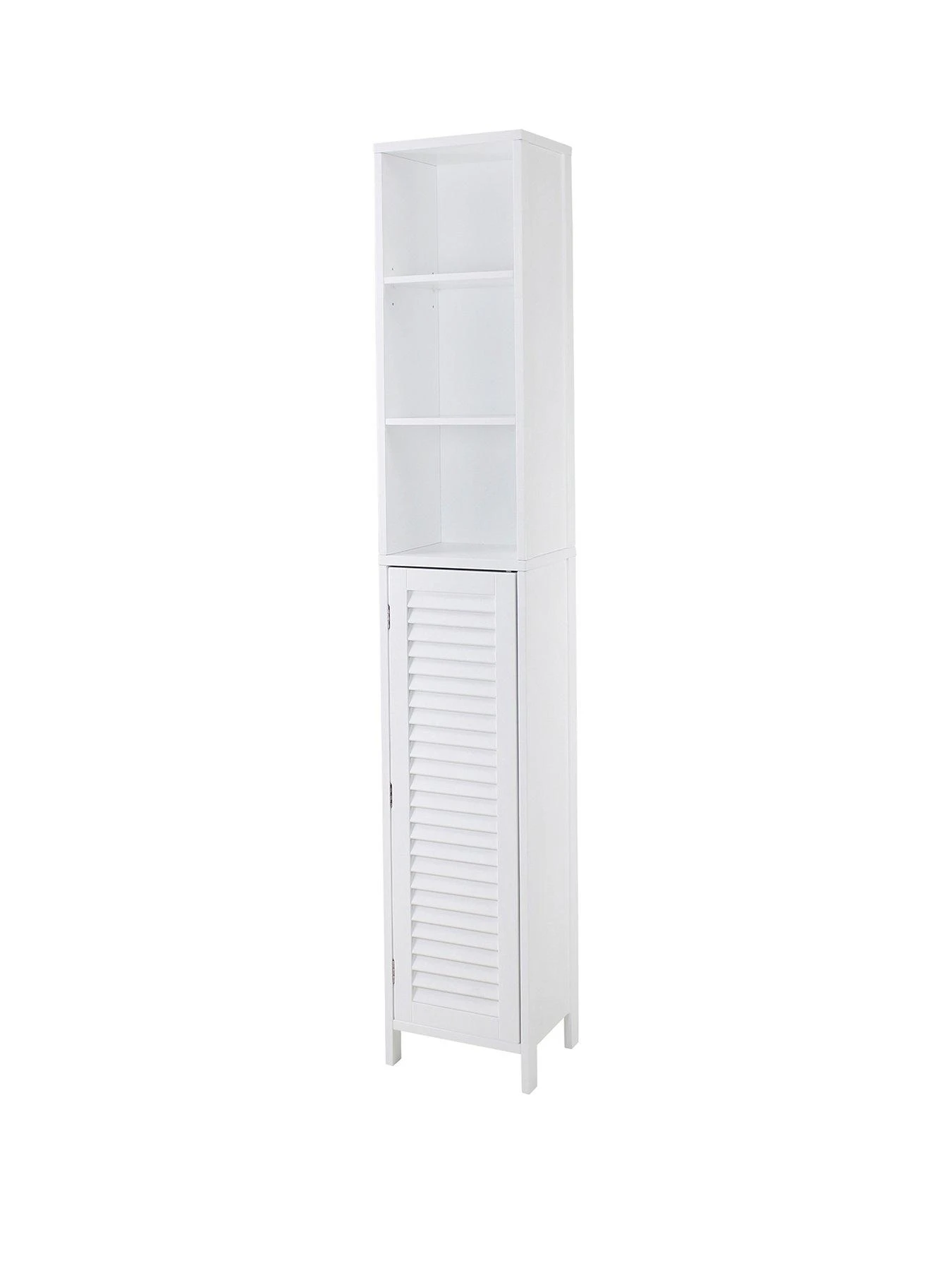 Simple yet eye-catching in a classic white painted finish, the unique look sees three internal shelves hidden behind a shutter-style single louvre door, as well as three external shelves on top. This means you can keep shower gel, bubble bath and other toiletries out of sight, while also displaying decorative pieces or hand towels.