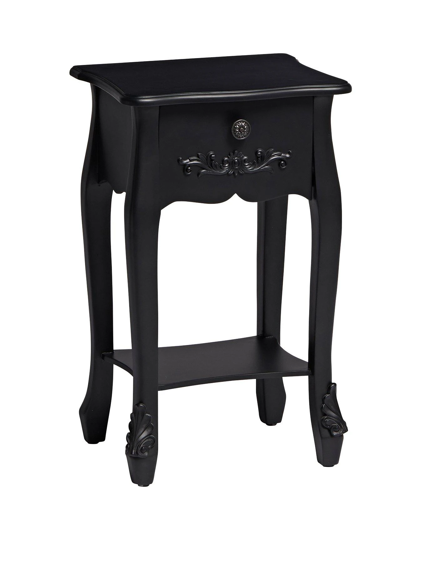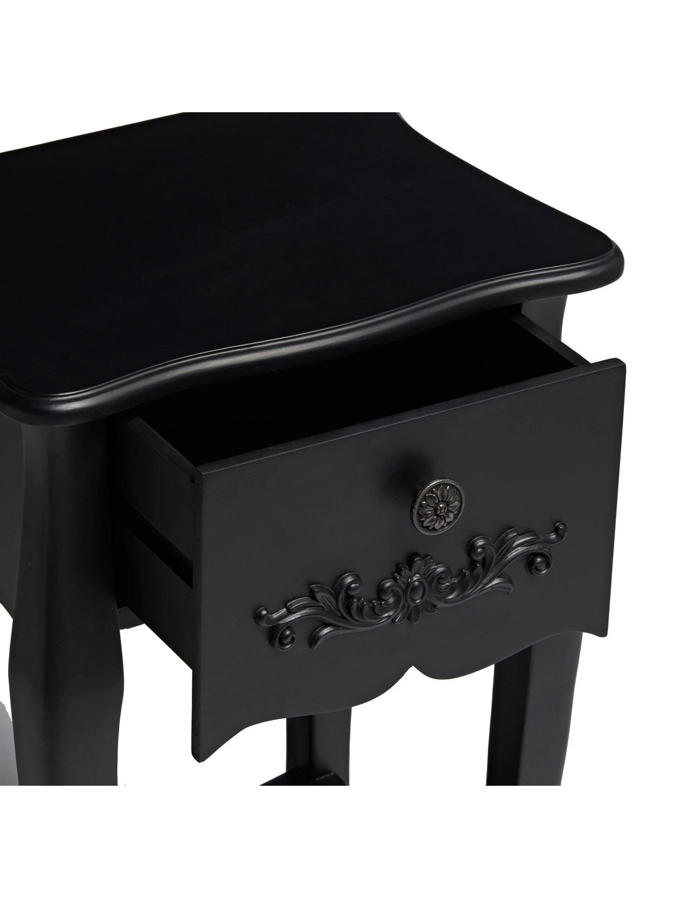 The legs and drawer front flaunt decorative carved panels and the drawer is accented with a metal handle. The shaped top is perfect for sitting a lamp, while a single drawer allow you to organise your bedside essentials.
