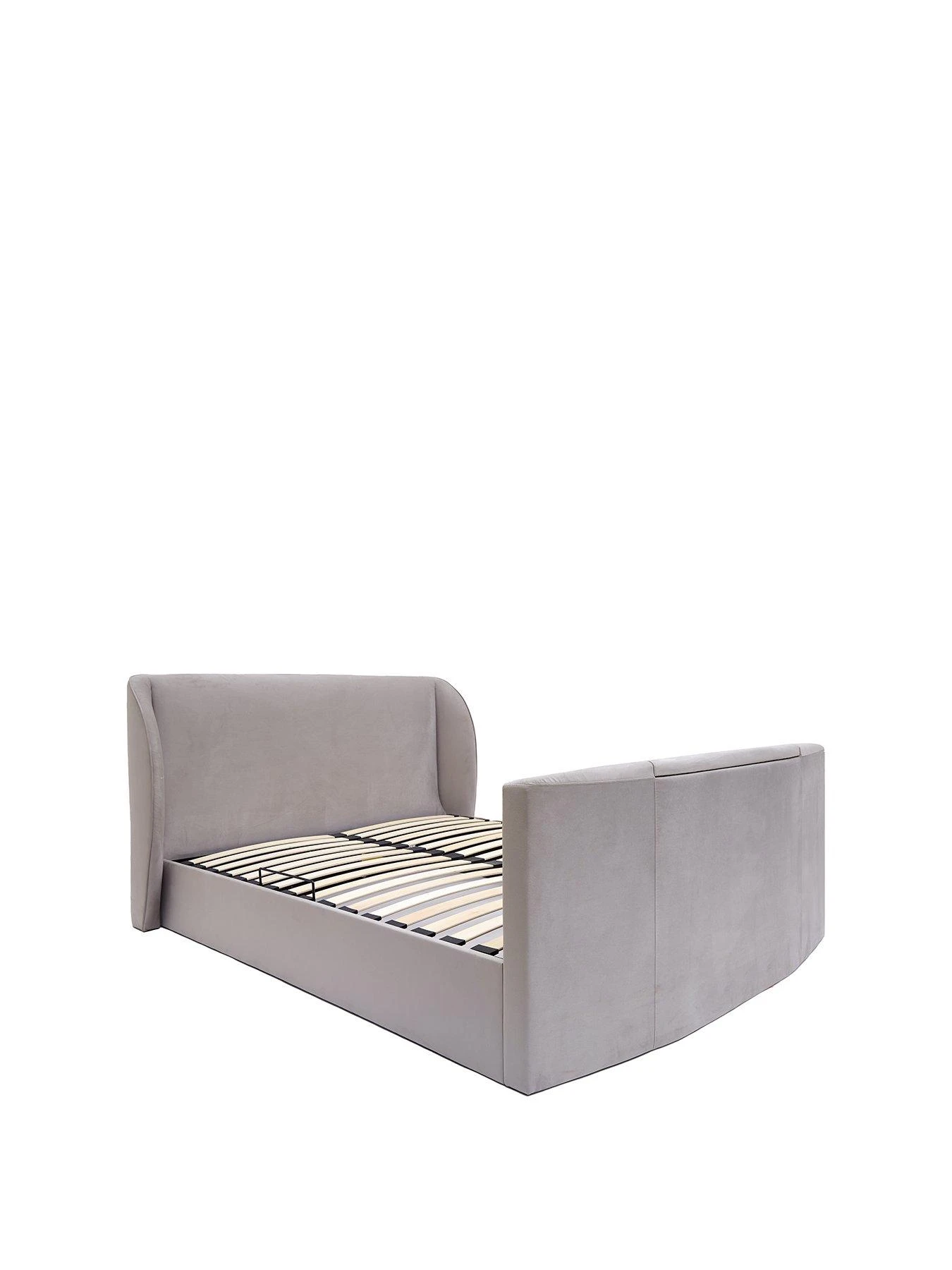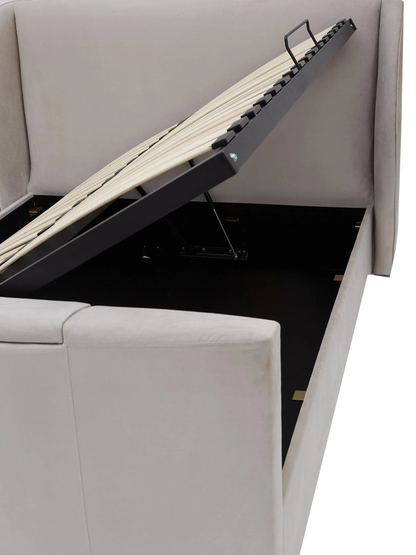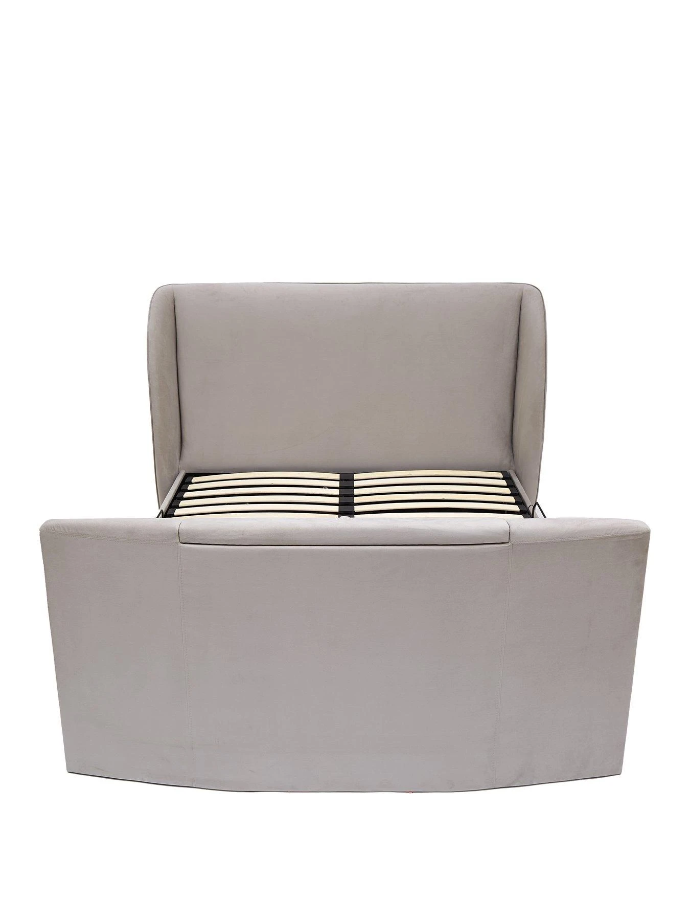Upholstered in a soft and textural grey coloured fabric, its large winged headboard is softly padded for extra comfort when you’re sitting up in bed. The sprung slatted base can be manually lifted with the help of the hydraulic pistons to reveal a large storage area where you can keep spare bedding organised and out of sight.