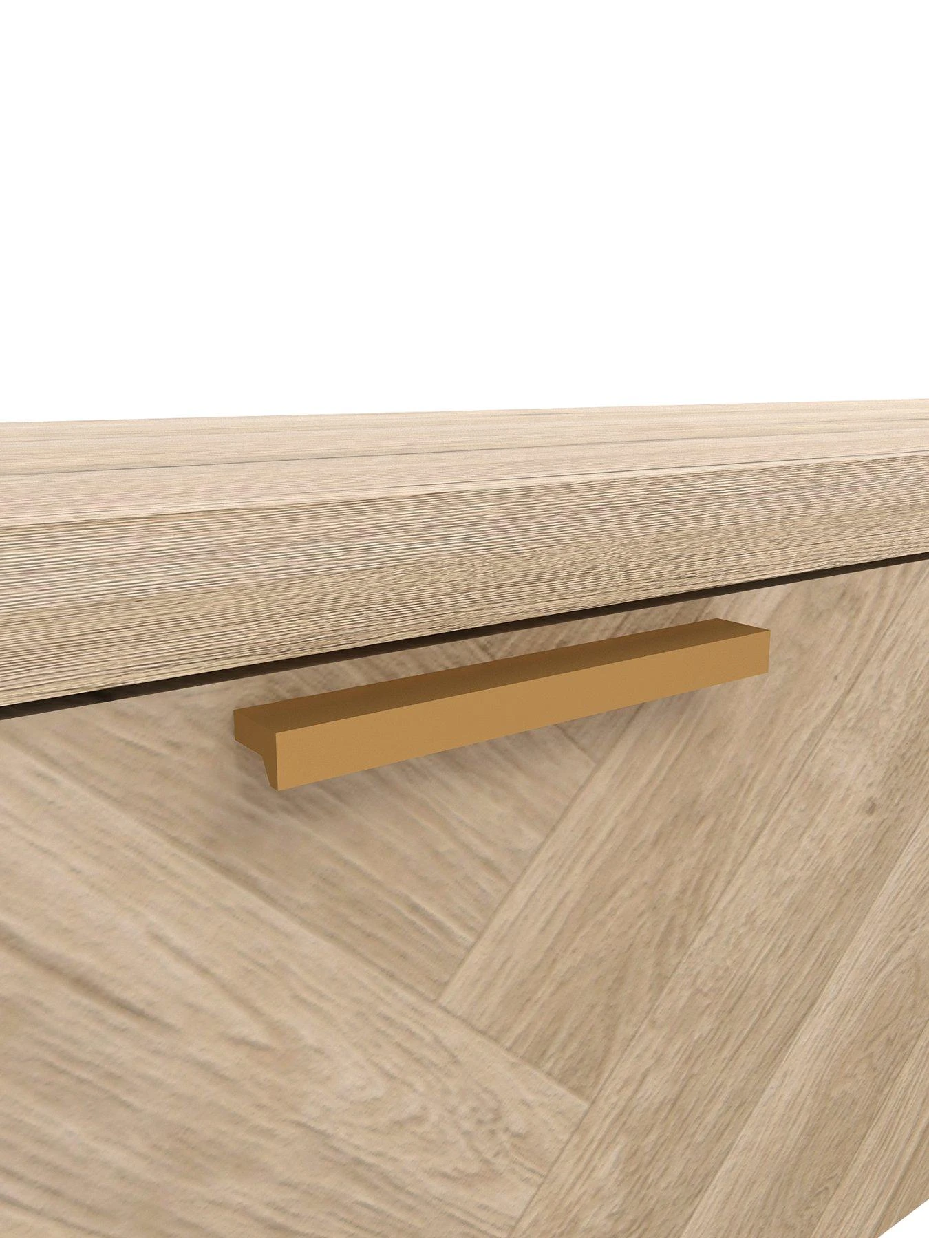Finished in a warm oak-effect with a deep, realistic grain, its door flaunts a striking parquet design. The furniture sits on metal legs for a contemporary industrial influence that’s softened by a rich rose gold tone, and the look is echoed by the metal handle.