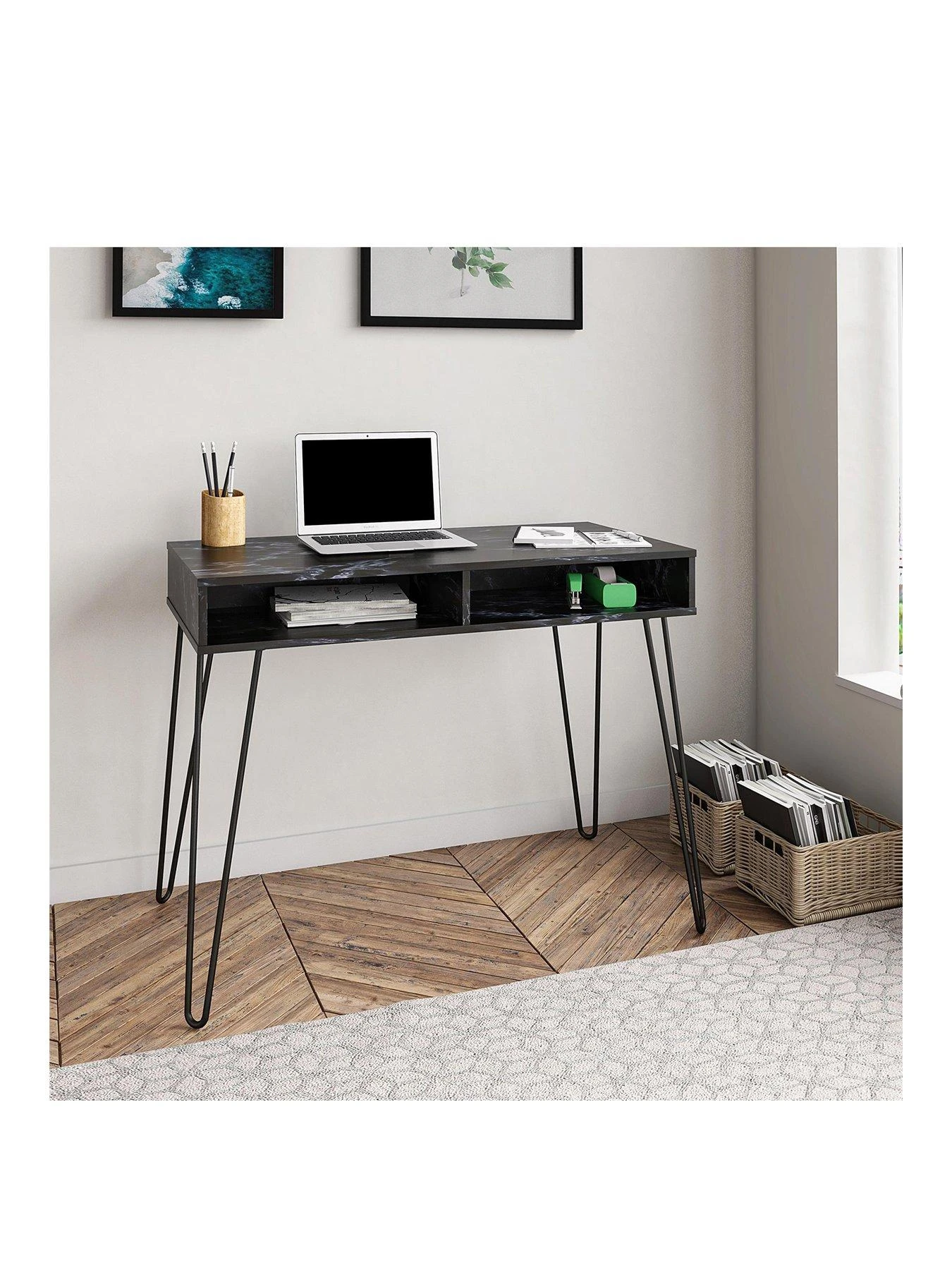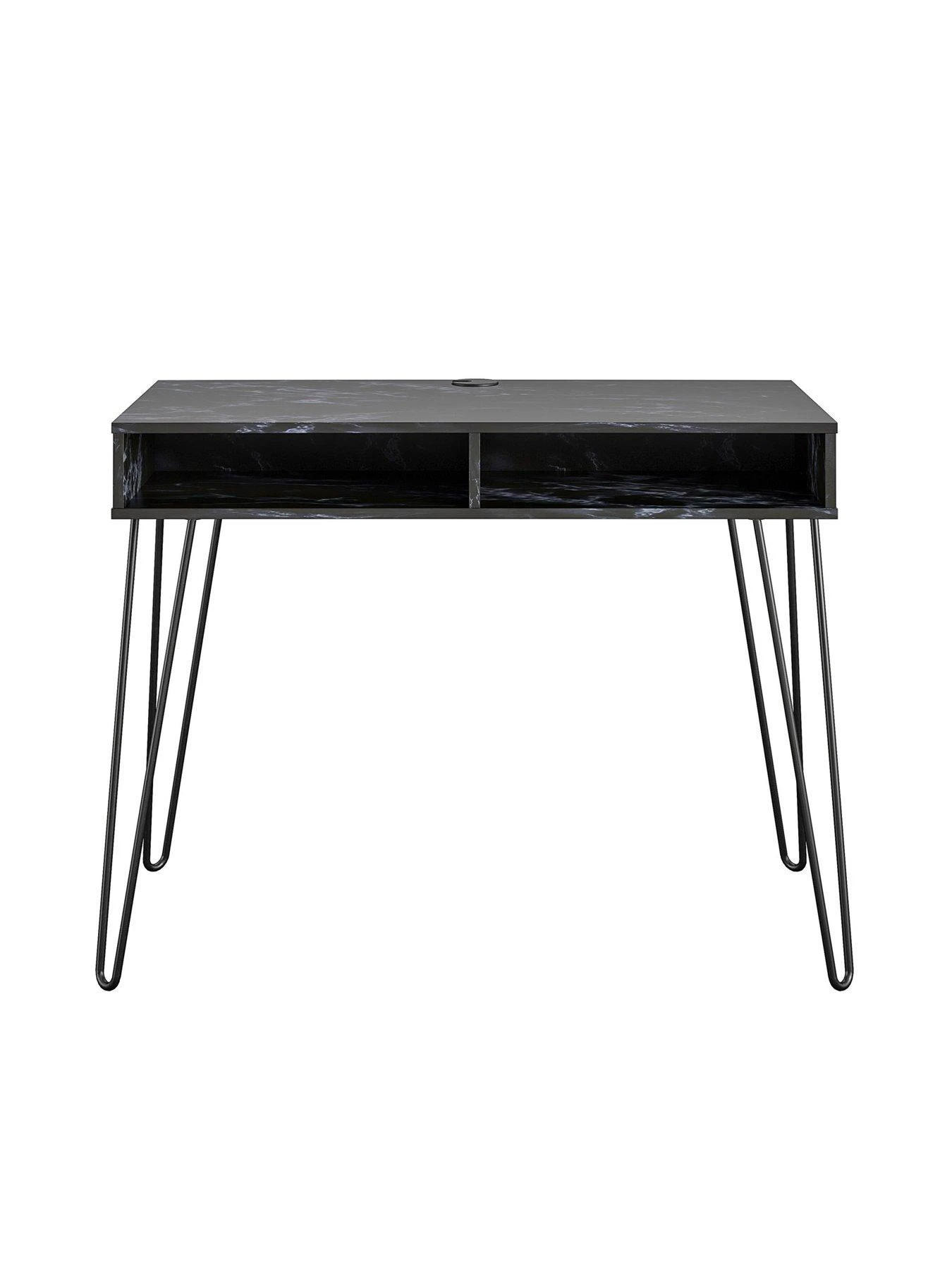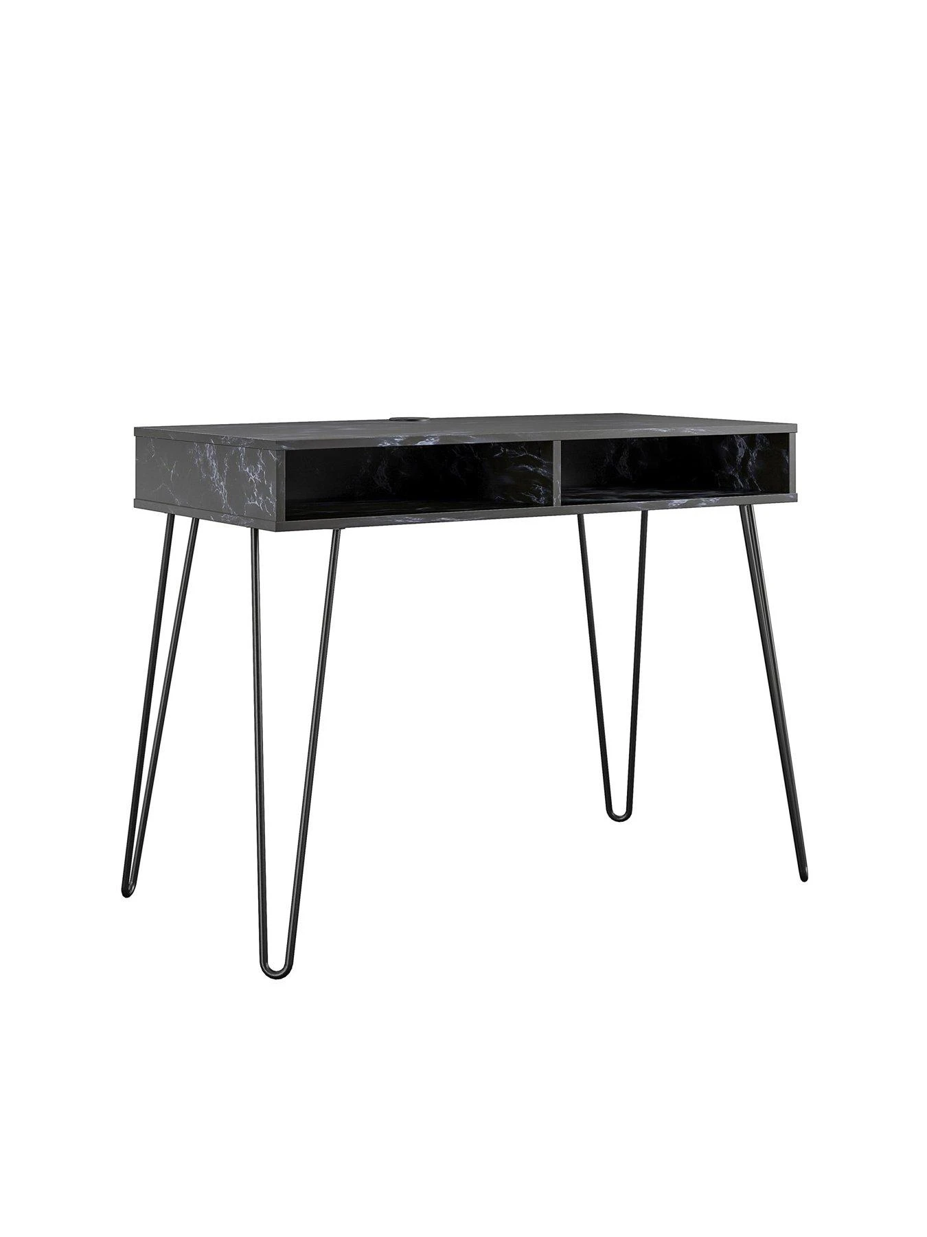 It’s finished in a stunning black marble-effect that’s rich in those distinctive veins and swirls, while the area under the desk contains two open cubbies for keeping stationery and more close-to-hand. This drawer-free design results in an uncluttered appearance, an effect that’s heightened by the trendy slimline metal hairpin legs – all wrapped in a matching black shade.