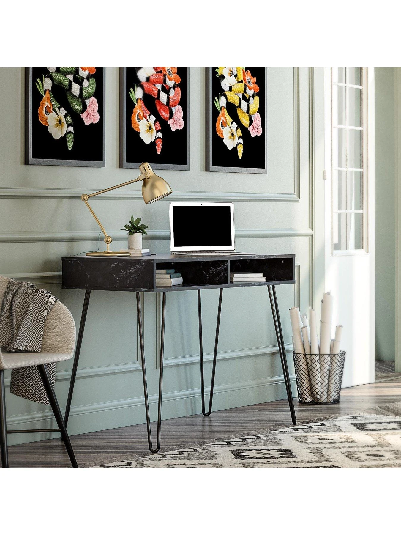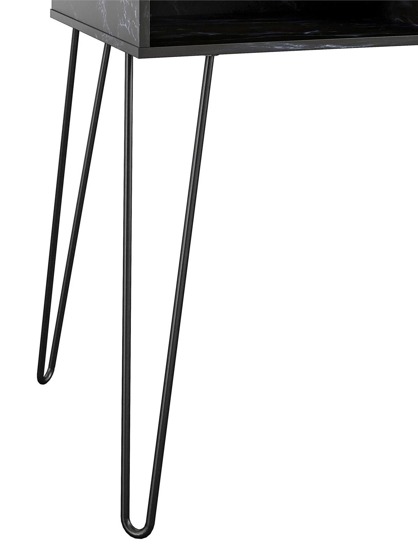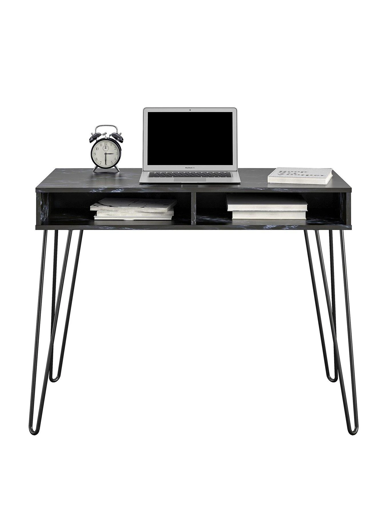 It’s finished in a stunning black marble-effect that’s rich in those distinctive veins and swirls, while the area under the desk contains two open cubbies for keeping stationery and more close-to-hand. This drawer-free design results in an uncluttered appearance, an effect that’s heightened by the trendy slimline metal hairpin legs – all wrapped in a matching black shade.