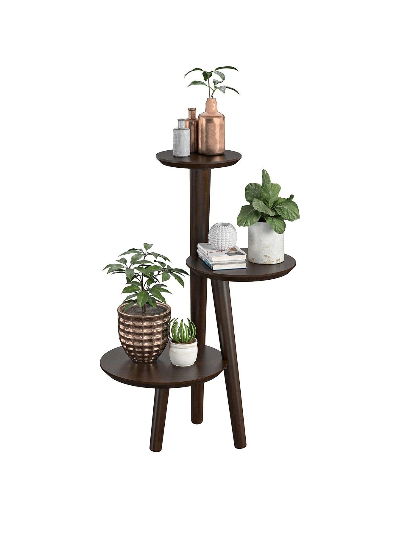 Finished in a beautiful walnut-effect on a real wood veneer that gives the look and feel of real wood and pairs perfectly with the angled real wood legs. Styled to resemble classic 50s furniture, the mid-century modern design features three circular shelves of different sizes that sit at different heights to give your favourite flowers or pot plants a striking multi-level look.