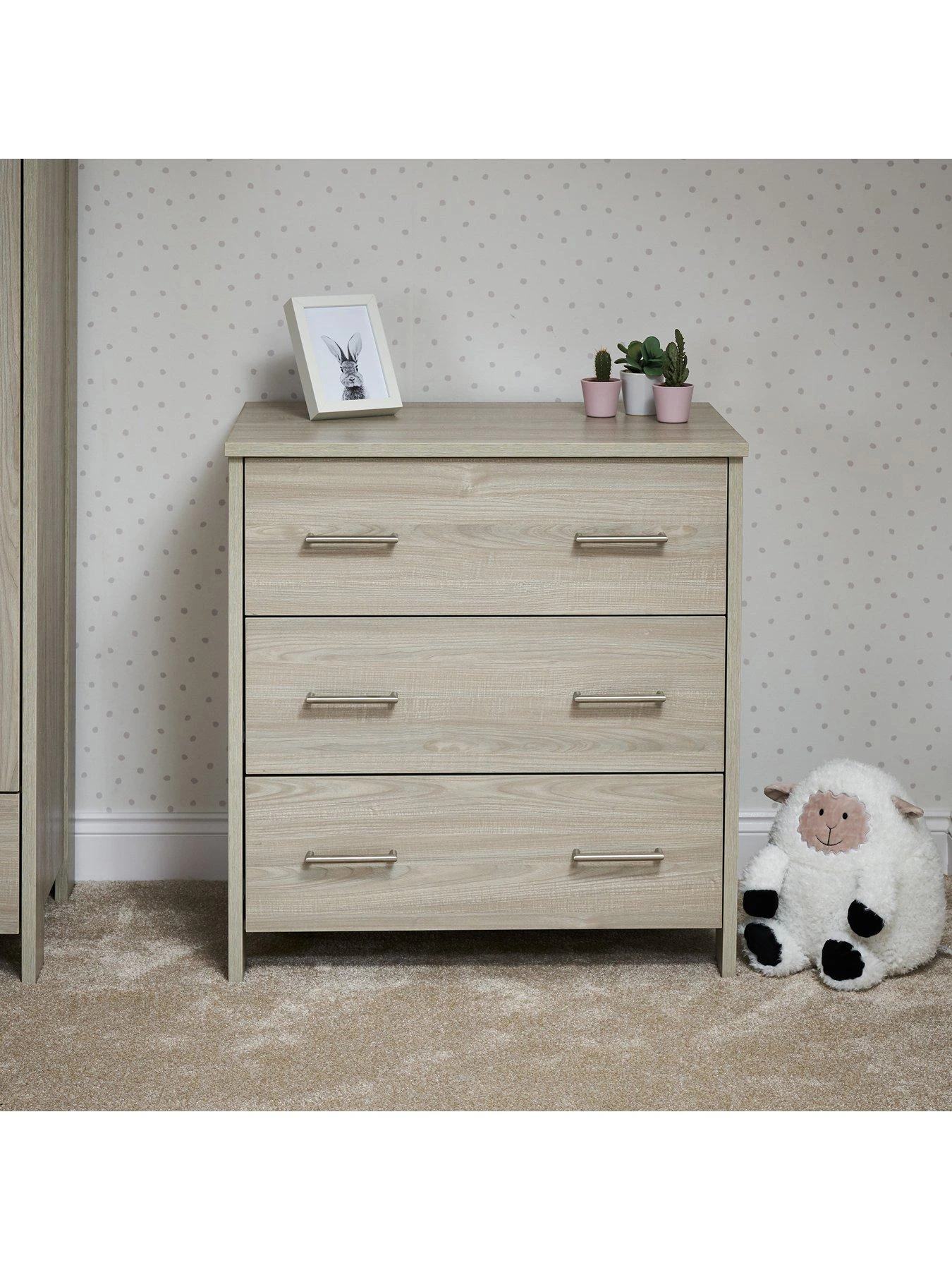 The Nika changing unit provides a spacious changing area at a comfortable height for parents at the top, with 3 spacious drawers with brushed metal handles and smooth runners for all baby’s changing essentials. The removable changing top can easily accommodate a standard 76 x 46cm baby changing mat and looks fantastic alongside the rest of the Nika nursery set.