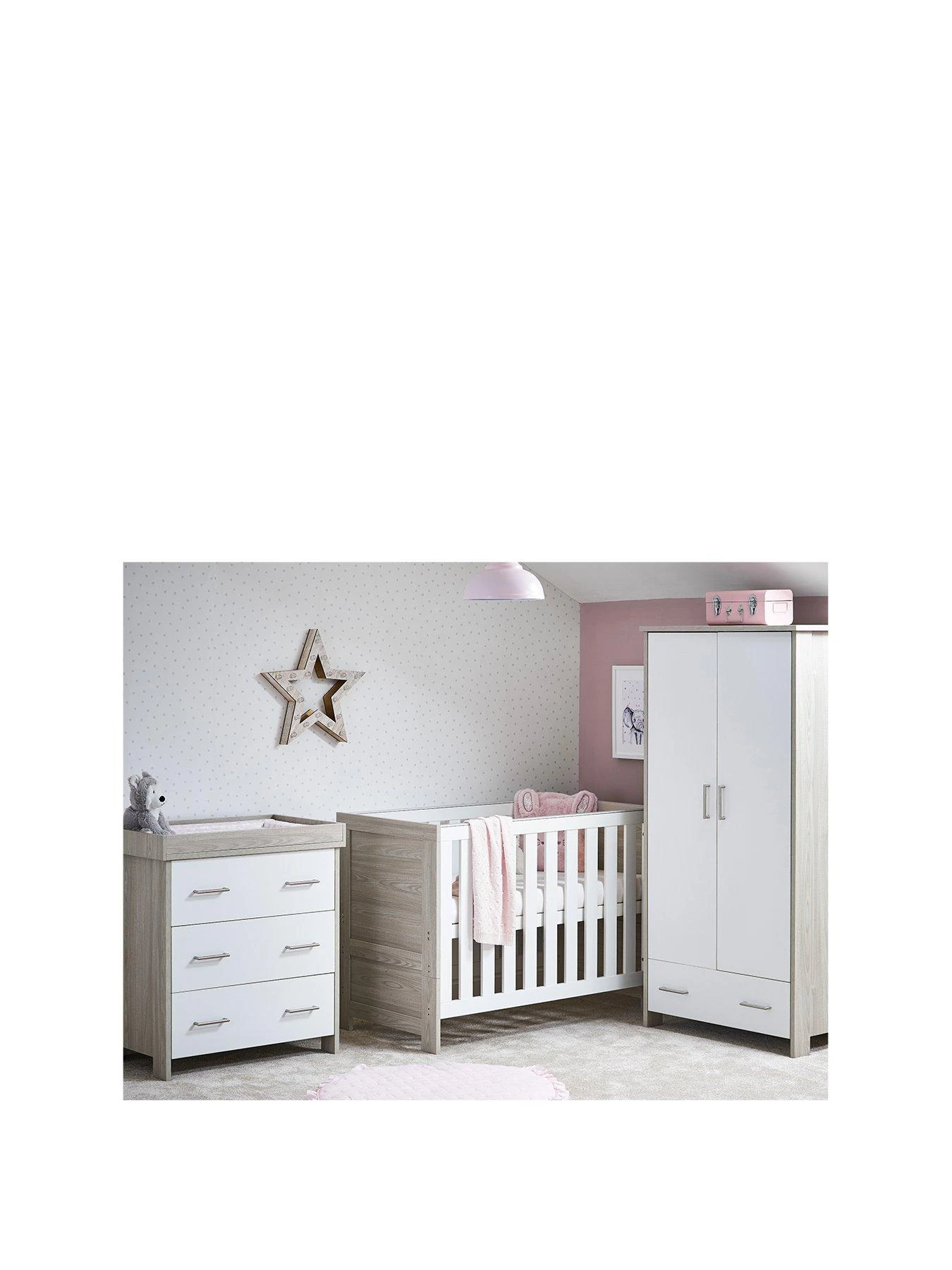 - Room set includes Nika Mini cot bed, changing unit and double wardrobe