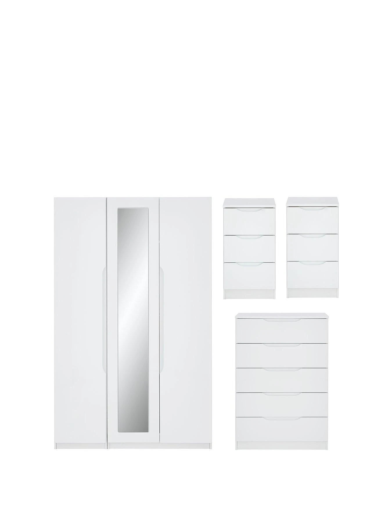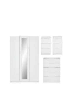 This great value Part Assembled 4 Piece Monaco Gloss Bedroom Furniture Package contains a 3 Door Mirrored Wardrobe, Chest of 5 Drawers and a Pair of 3 Drawer Bedside Chests