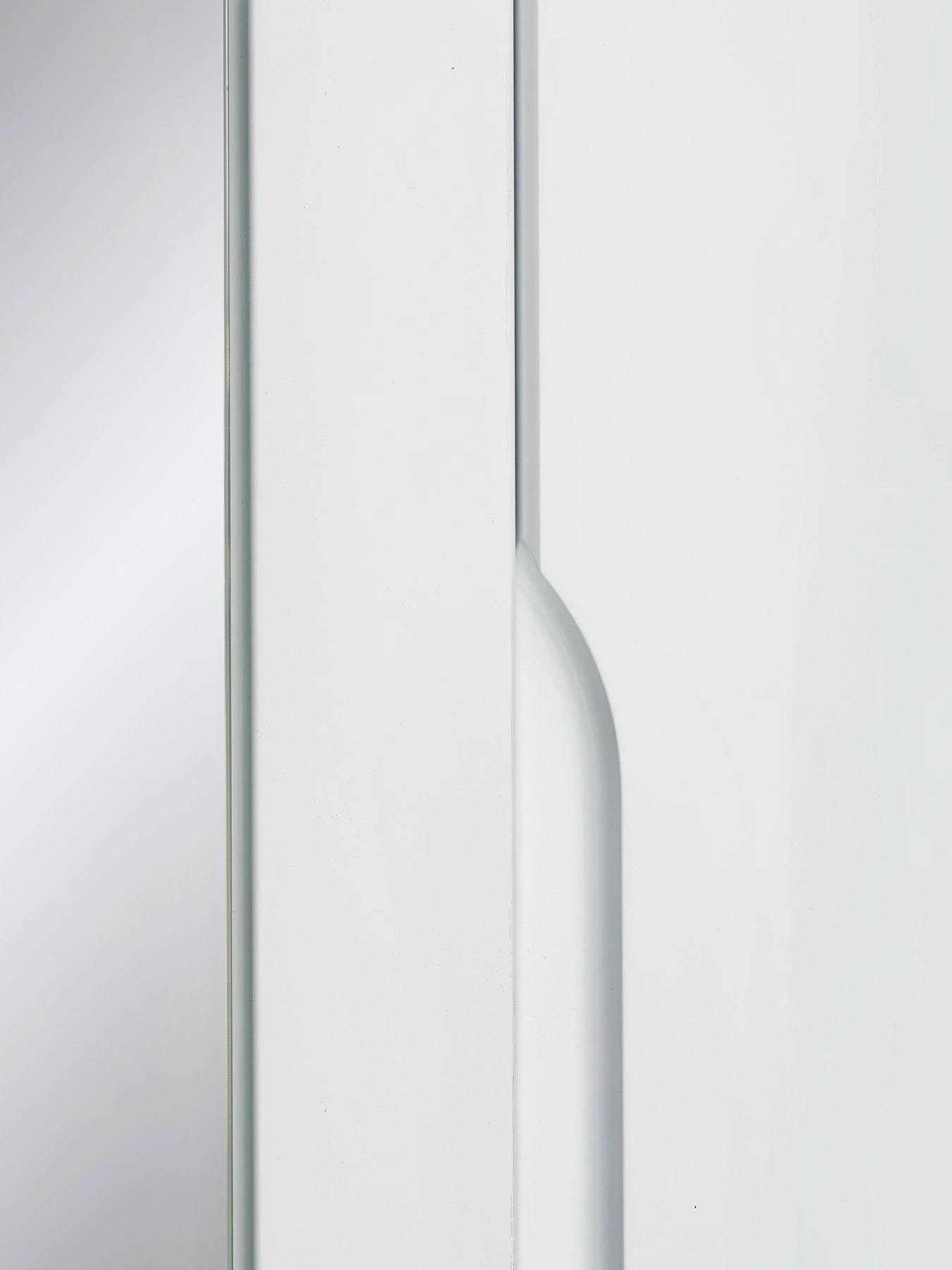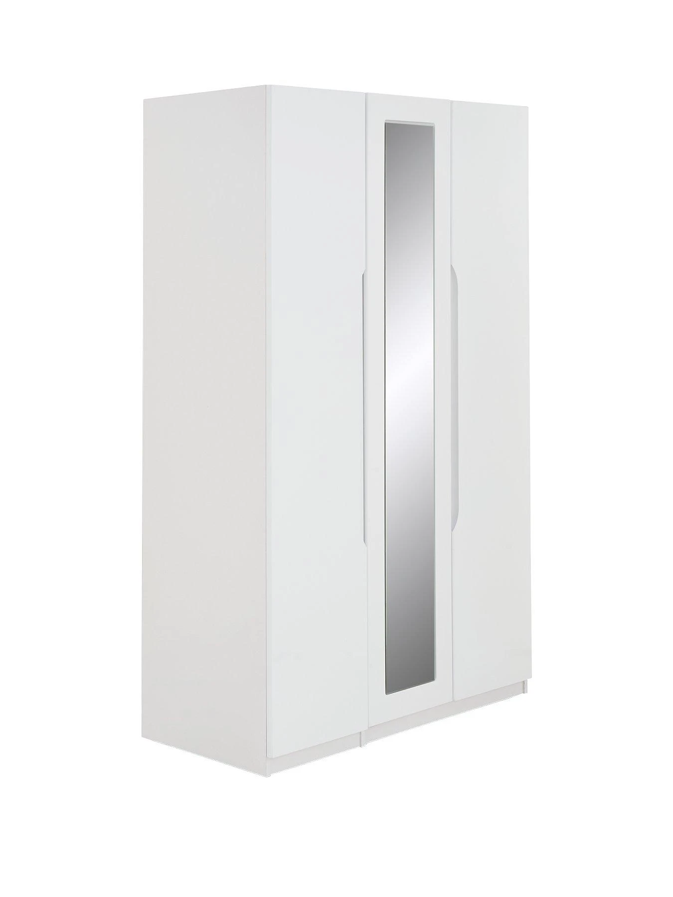The wardrobe has a mirrored centre door and contains a hanging rail and high shelf to the wider side, plus a series of 4 shelves behind the single door. Adjustable metal hinges allow for easy alignment on uneven floors.
