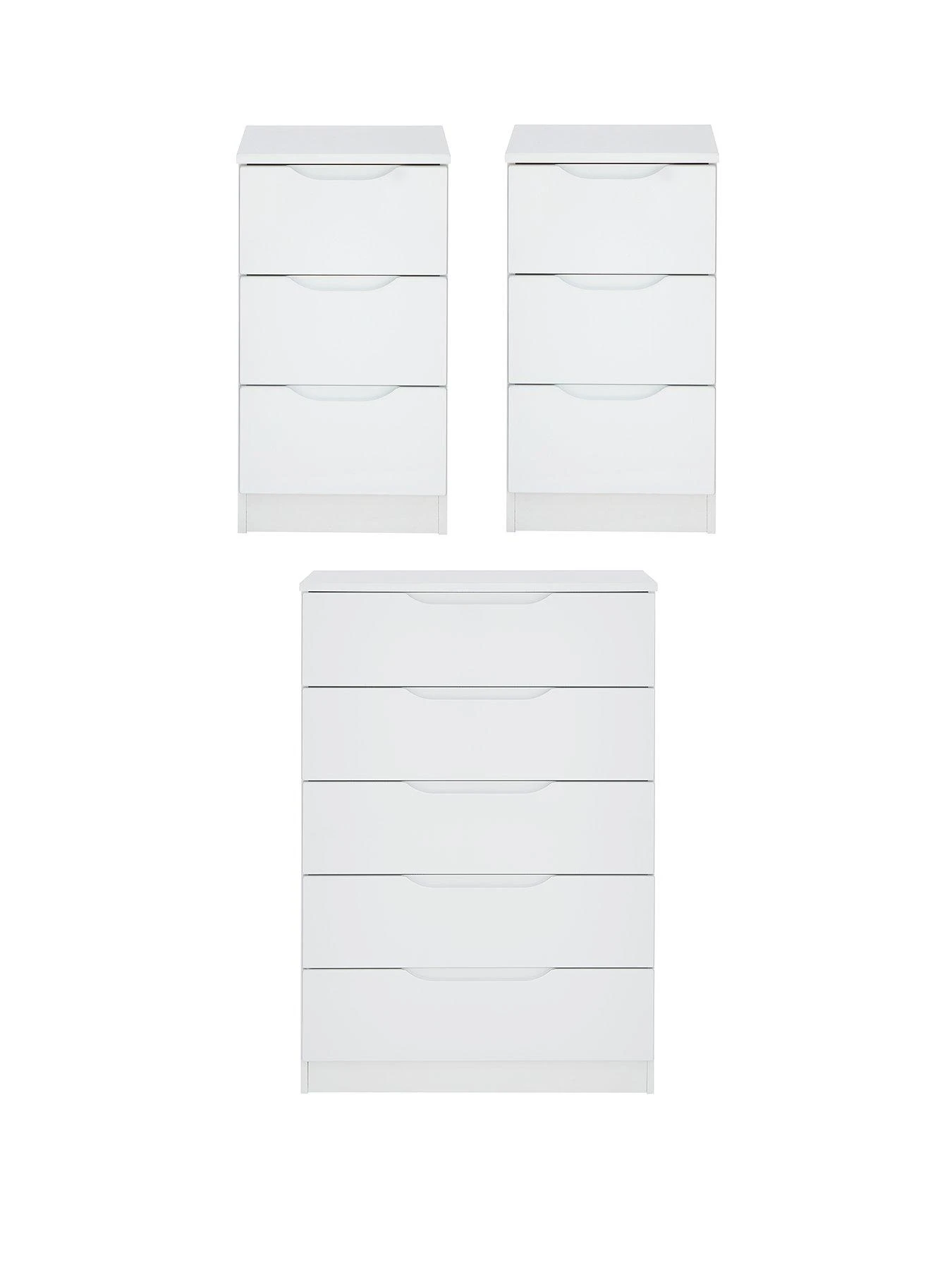 This great value Ready Assembled 3 Piece Monaco Gloss Bedroom Furniture Package contains a Chest of 5 Drawers and a Pair of 3 Drawer Bedside Chests